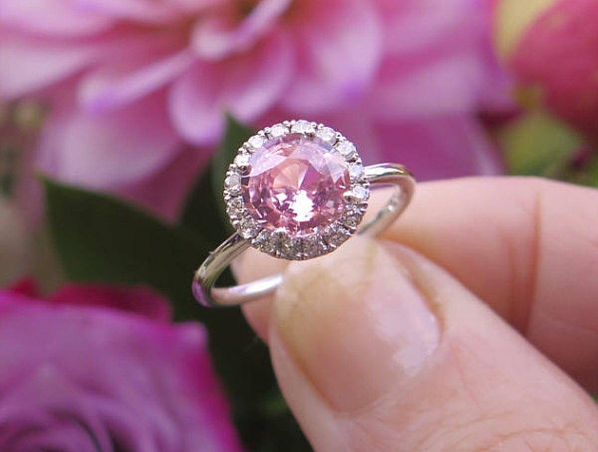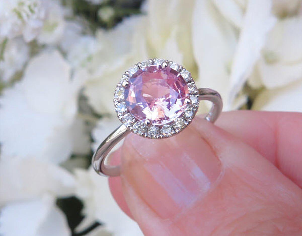 Real peachy pink round sapphire engagment ring with real diamond halo in 14k white gold