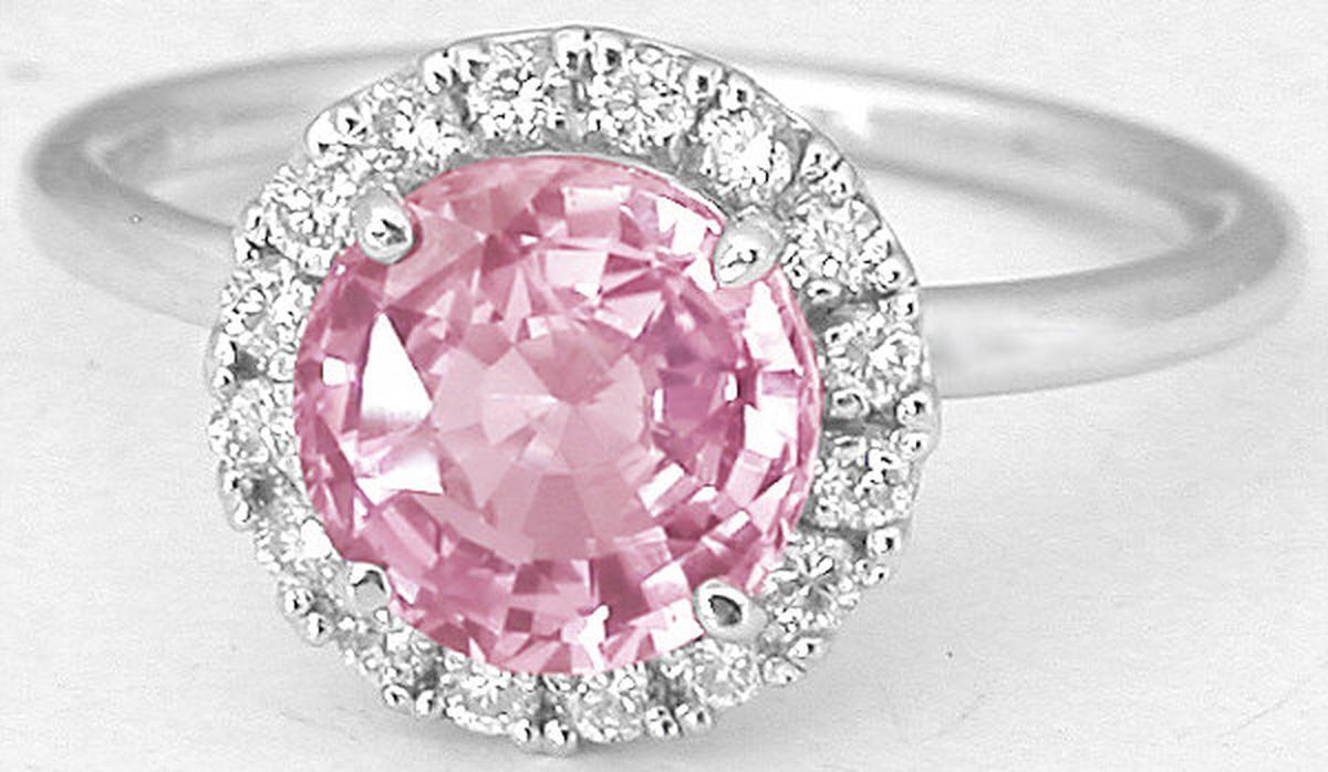 Gemstone: Natural Pink Sapphire- Ceylon Round Cut Pink Sapphire and Diamond Halo Engagement Ring