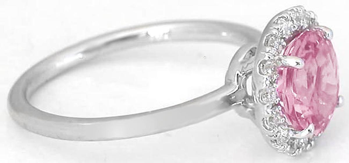 Special Features: Indulge in the sheer beauty of this stunning ring, a perfect blend of minimalistic charm and undeniable allure. For ladies who prefer their jewelry to speak for itself, this design is the epitome of sophistication. The star of the show is the breathtaking pink sapphire that demands attention. The true star of the show is the stunning pink sapphire that commands attention. With a generous size of 7.7mm and perfectly round shape, this gemstone is a rare and sought-after find. What sets it apart is its delicate and elusive light padparadscha color, making it truly unique. The soft peachy pink hue is captivating and utterly enchanting. With a brilliant cut and being eye-clean, this sapphire's allure is undeniable. The diamond halo is a perfect addition, enhancing the sapphire's beauty and drawing attention from every angle. The band is understated and simple, a 1.5mm plain white gold band that highlights the sapphire and diamond halo. This ring is the perfect choice for women seeking a ring with a refined, subtle beauty that will always remain in style.