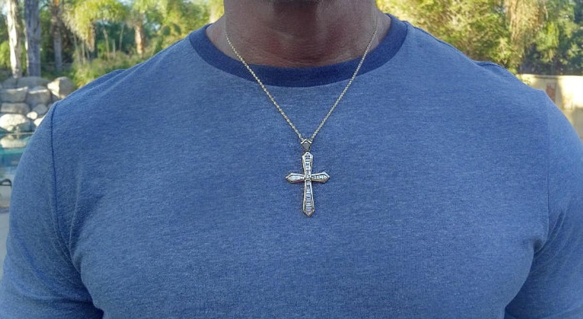 Diamond Weight: 2.65 carats total weight (ctw) Men's Large 3 carat Baguette Real Diamond Cross in 18k yellow gold for sale