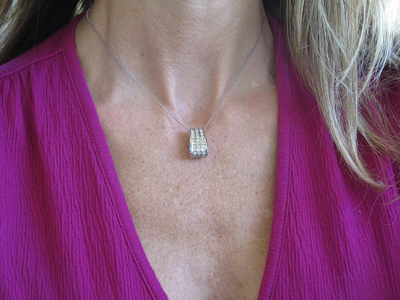 Special Features: The simple and classically styled diamond slide features 3 rows of channel set round diamonds with a carat weight of 1.2 carats. This piece is a slide style pendant and looks amazing on a 3-6mm omega necklace. Elegant and eye catching, but not overdone.
