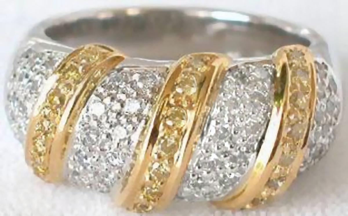 Special Features: Introducing our exquisite diamond ring, a true masterpiece of elegance and craftsmanship. This stunning piece features a dazzling array of pave white diamonds, meticulously set in luxurious platinum. The brilliance of the white diamonds is beautifully complemented by delicate ribbons of 18k yellow gold, each adorned with captivating canary yellow diamonds.