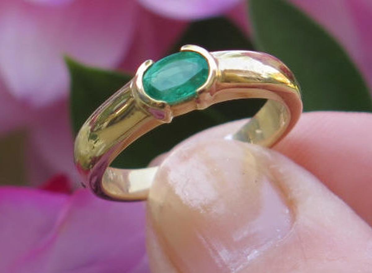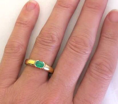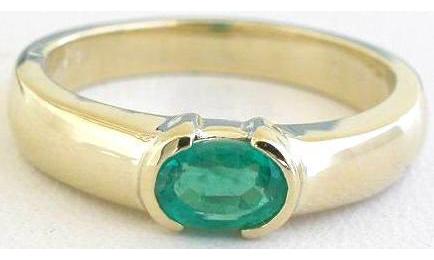 Special Features: Simple yet elegant, this sleek ring features a 6x4mm oval emerald, set east west with modern styling. The emerald is a bright grassy green with great clarity. The semi-bezel setting holds the emerald securely and creates a flat profile. The ring is easy to wear and you won't have to worry about prongs or the height of the ring getting in the way.  The mounting is substantial and the ring is very comfortable on the finger.