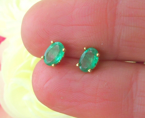 Special Features:Beautiful 6x4mm oval emeralds, nicely matched, set into a 14k yellow gold scroll design stud earring. These emeralds look amazing and don't have any distracting black spots nor do they appear cloudy. The color is a wonderful light grassy green color. These earrings are for pierced ears and perfect for every day wear.