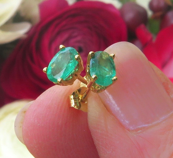 Natural Oval Solitaire Emerald Earrings in real 14k yellow gold for sale