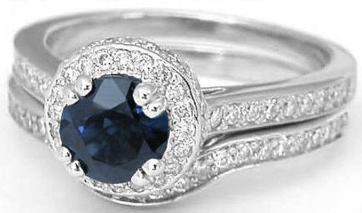 Dark Blue Sapphire Diamond Halo Engagement Ring with Matching Diamond Wedding Band