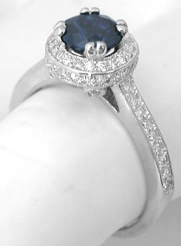 Special Features: This ring features a 1 carat dark blue sapphire in a gorgeous diamond encrusted halo setting. The sapphire is a dark navy blue with flashes of royal blue when the facets catch the light. The sapphire is held securely by four sets of double prongs so this is an ideal ring for every day wear. The diamond halo that surrounds the sapphire has diamonds on the top and sides so even when you glance down at the ring on your finger, you see the beautiful shiny diamonds sparkling back at you. There is an open gallery beneath the sapphire to let the light in. And the cathedral style shank is also accented half way around with tiny diamonds.