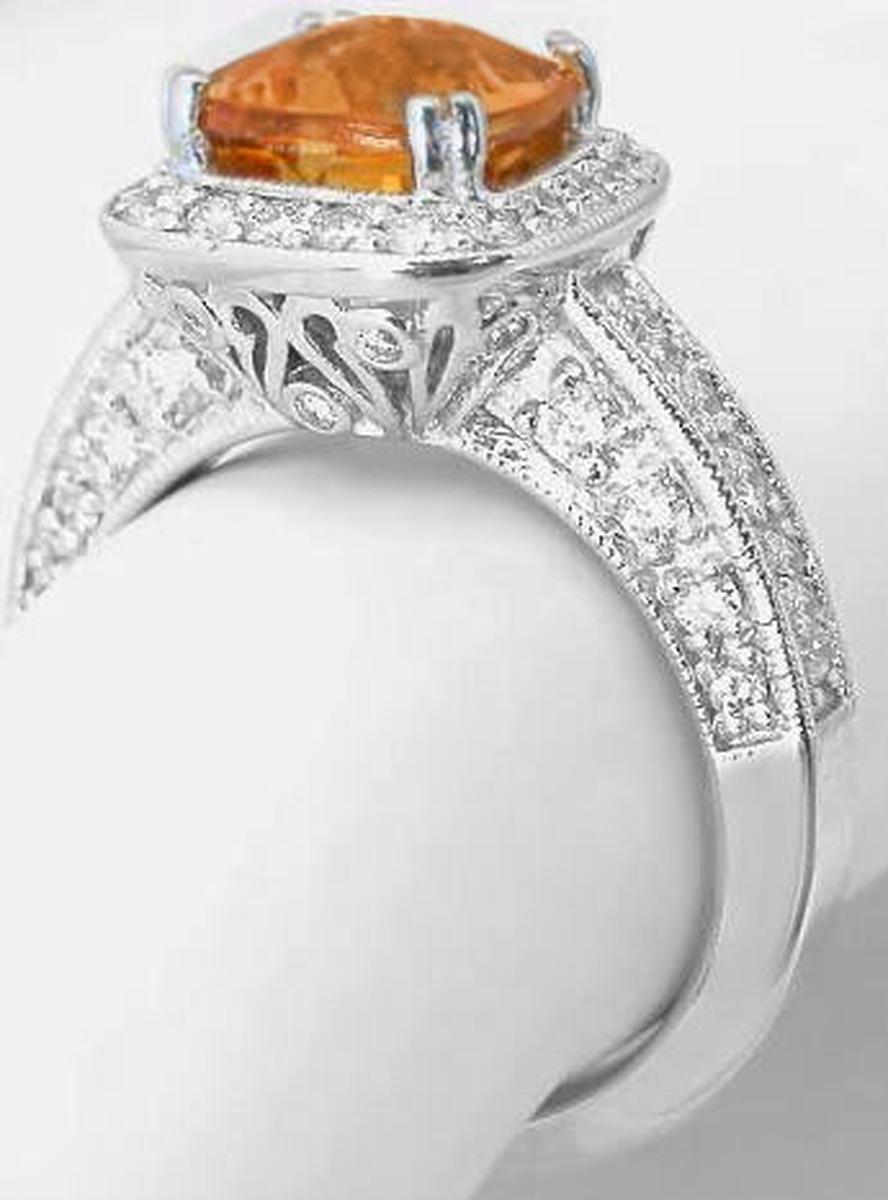 Special Features:A MJS Original Design: This has been a popular ring for us for awhile now and we have redesigned it with higher quality diamonds and with a modified gallery. The new gallery has a beautiful and elegant scroll pattern accented with diamonds and also tapers in gently. The citrine at the center is a 8mm cushion with checkerboard faceting on top. It has a gorgeous medium yellow orange color. It is lively, eye clean and looks amazing in the fancy mounting that is completely encrusted in fine diamonds.  Diamonds surround the citrine and more bead set diamonds adorn the top and sides of the shank.  The milgrain edging adds a vintage feel to the piece, and the ring is finished off with a beautiful undergallery.