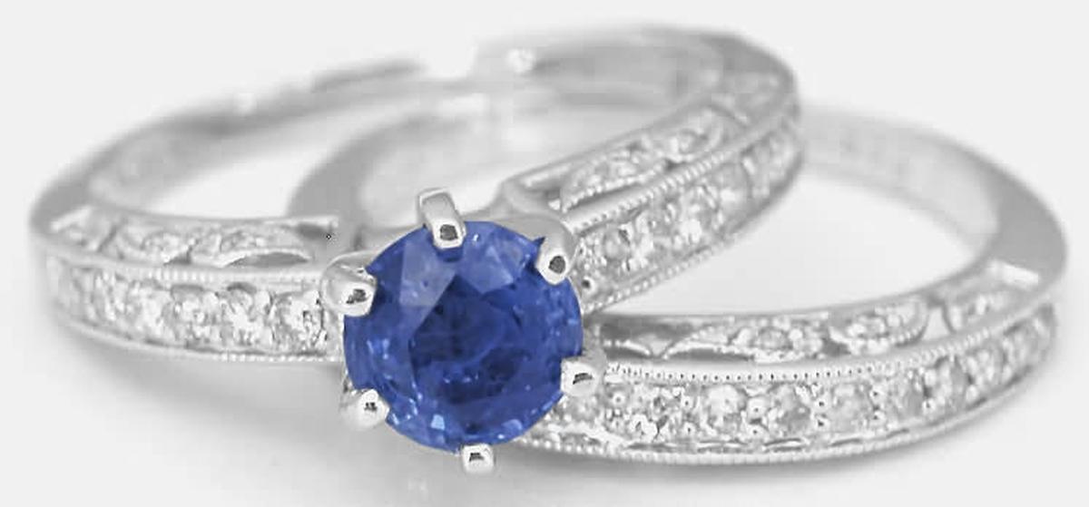 Ornate Vintage Style Ceylon Round Natural Blue Sapphire Engagement Ring and Band Set in 14k white gold for sale   Antique Design Round Natural Blue Sapphire Ring and Band Engagement Wedding Set in 14k white gold for sale   Vintage Ceylon Sapphire and Diamond Engagement Rings in 14k white gold