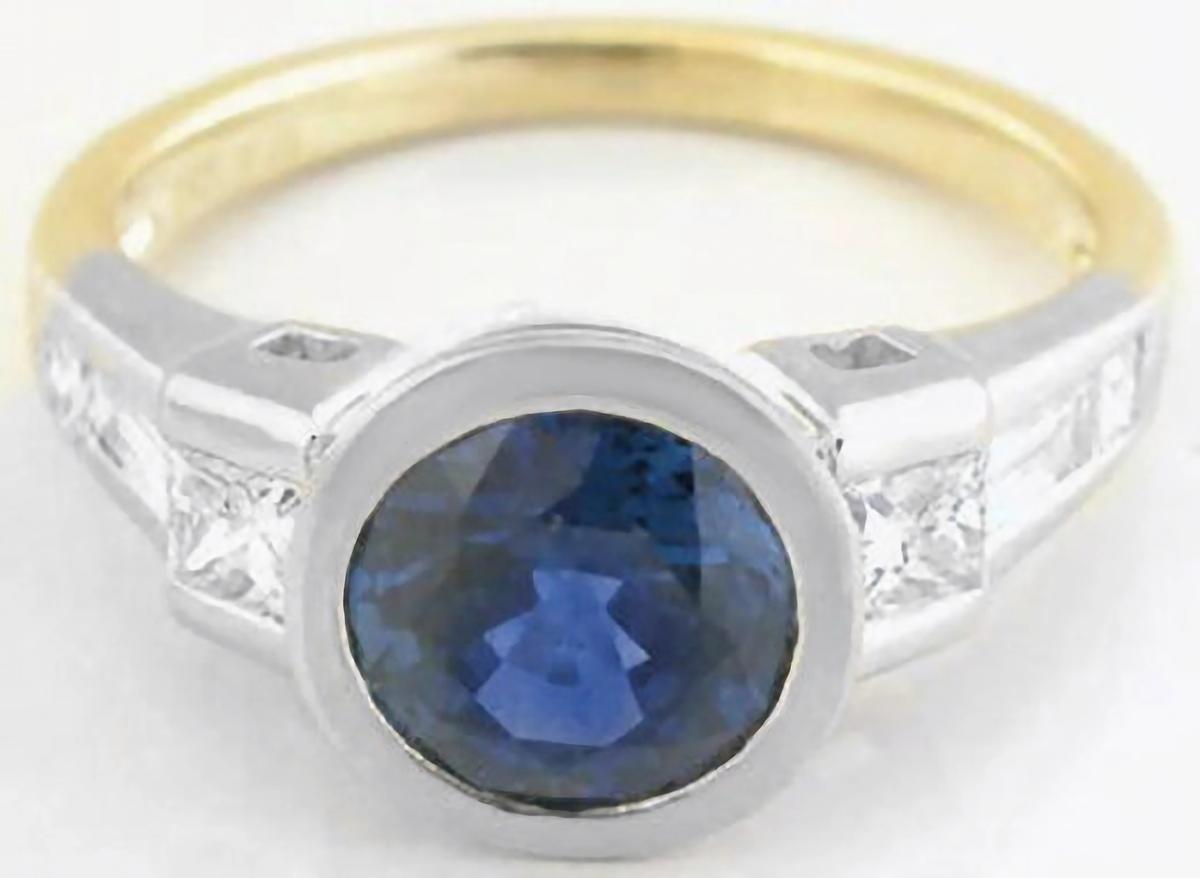 Bezel Set Natural Round Blue Sapphire and Real Princess Cut Baguette Diamond Engagement Ring in solid 18k gold for sale   Bezel Set Sapphire and Diamond Engagement Rings in 18k