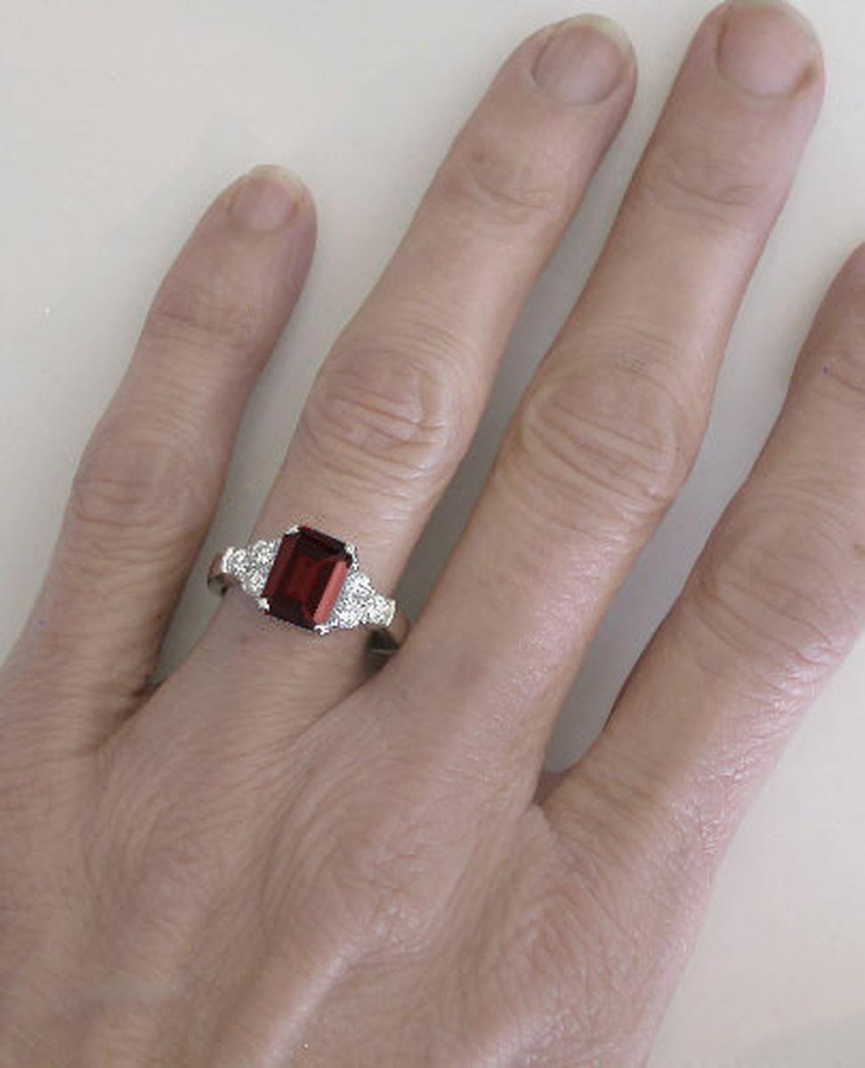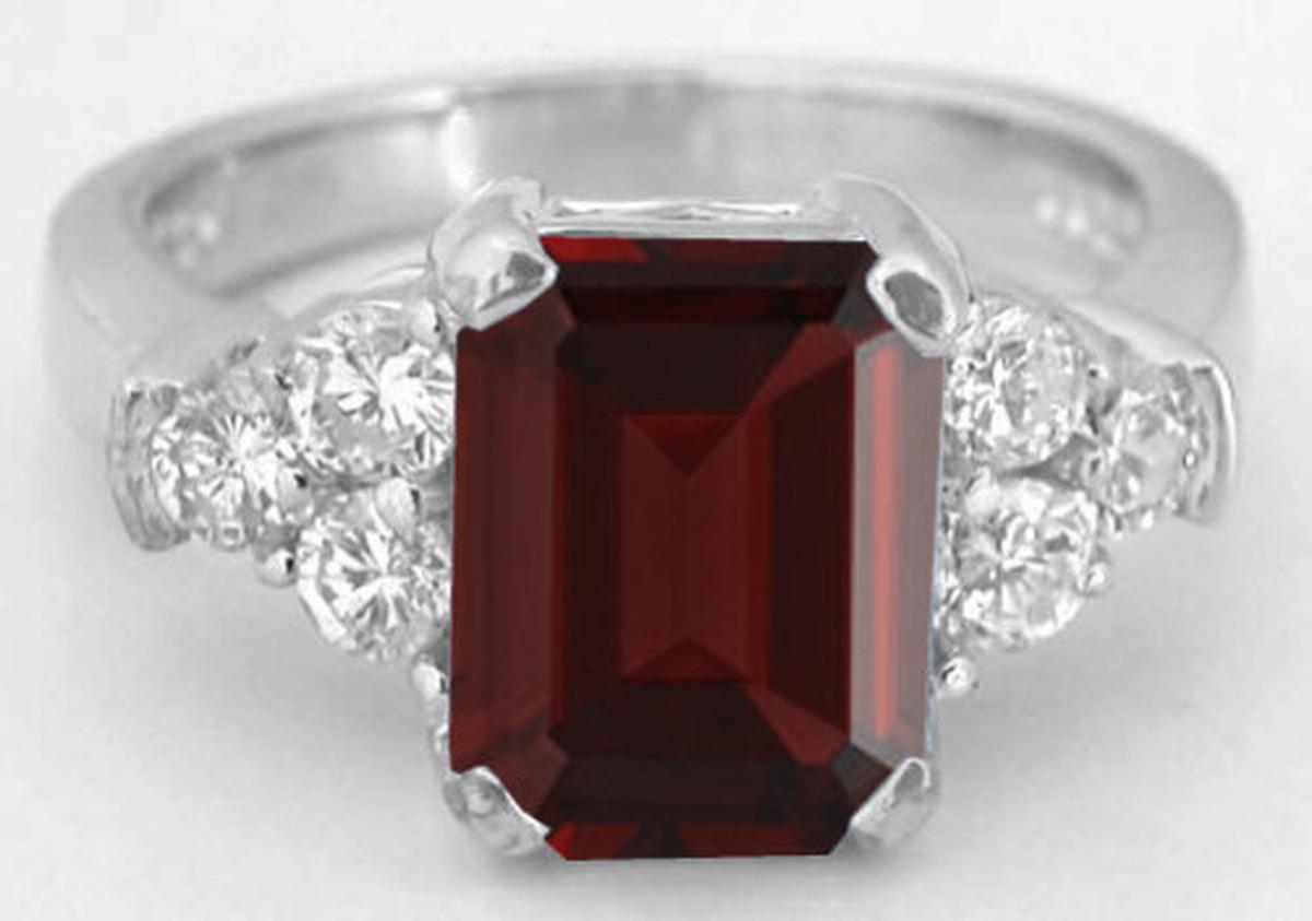 Special Features: No doubt about it the design of this garnet ring is simple. But that allows the gemstones to speak for themselves. The emerald cut garnet, with its long rectangular facets, is striking with its saturated burgundy red color. The three diamonds are of very fine quality, near colorless and eye clean, and they are nearly 9 points each!  That is a substantial size for an accent diamond and since they are also of high quality, they do have tremendous sparkle and shine. Notice the lattice styled detail on the basket holding the garnet. This allows the light in to make the stone come alive. The 14k white gold mounting has been designed to be durable and strong, from the total gram weight to the thickness of the prongs and the shank. This ring is not only going to feel great on the finger, it will easily stand up to frequent wear as well.