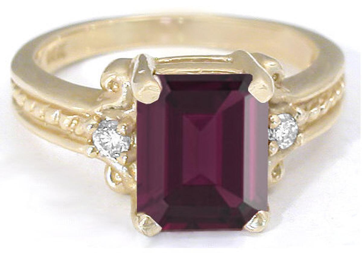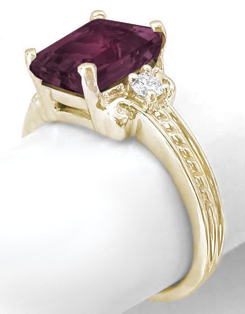 Special Features: This exceptional color of this large emerald cut rhodolite garnet is featured in this feminine design. A small diamond accents either side of the center stone and a twisted rope design extends down the shank. The color of this wonderful stone will invite many long glances of admiration.