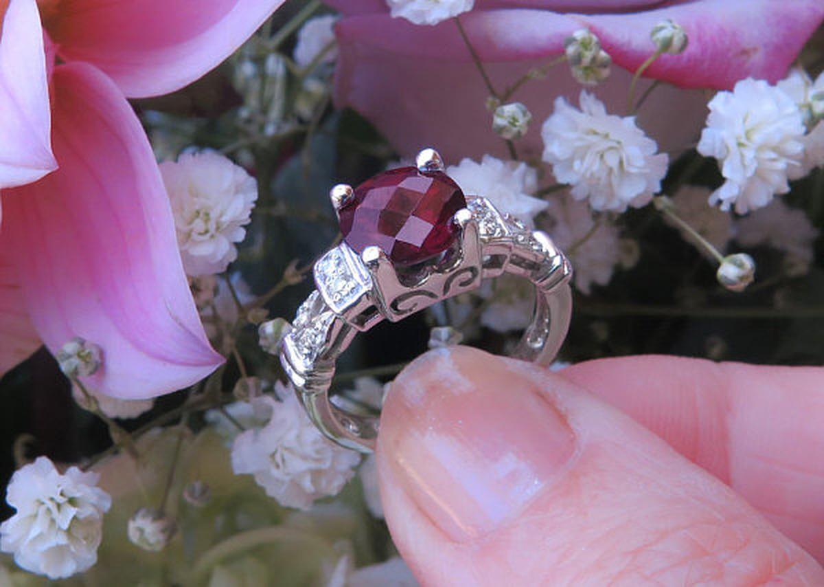 Buy a White Gold Round Checkerboard Cut Rhodolite Garnet Engagement Ring