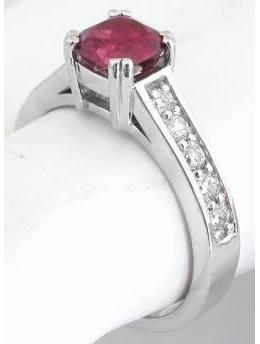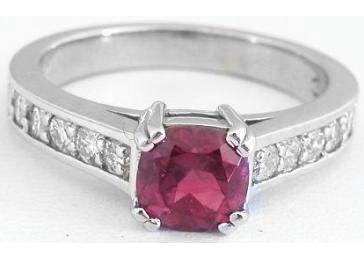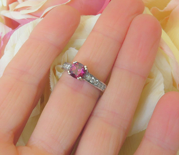 Special Features: For those of you who prefer simple, classic styling and elegance on a smaller scale, this gorgeous rhodolite garnet and diamond ring will suit you perfectly. The 6mm cushion cut gemstone at the center is a pretty pinkish red and is held by four double prongs. It is just about the size of a one carat diamond. The band is accented with ten very fine diamonds that are four points each. They add the perfect amount of sparkle and light up the entire band. The weight of the mounting is also ideal, it is thick not flimsy and will easily stand up to daily wear.  Gorgeous rhodolite, fine diamonds, and an elegant mounting, this beautiful ring will definitely make you feel special.