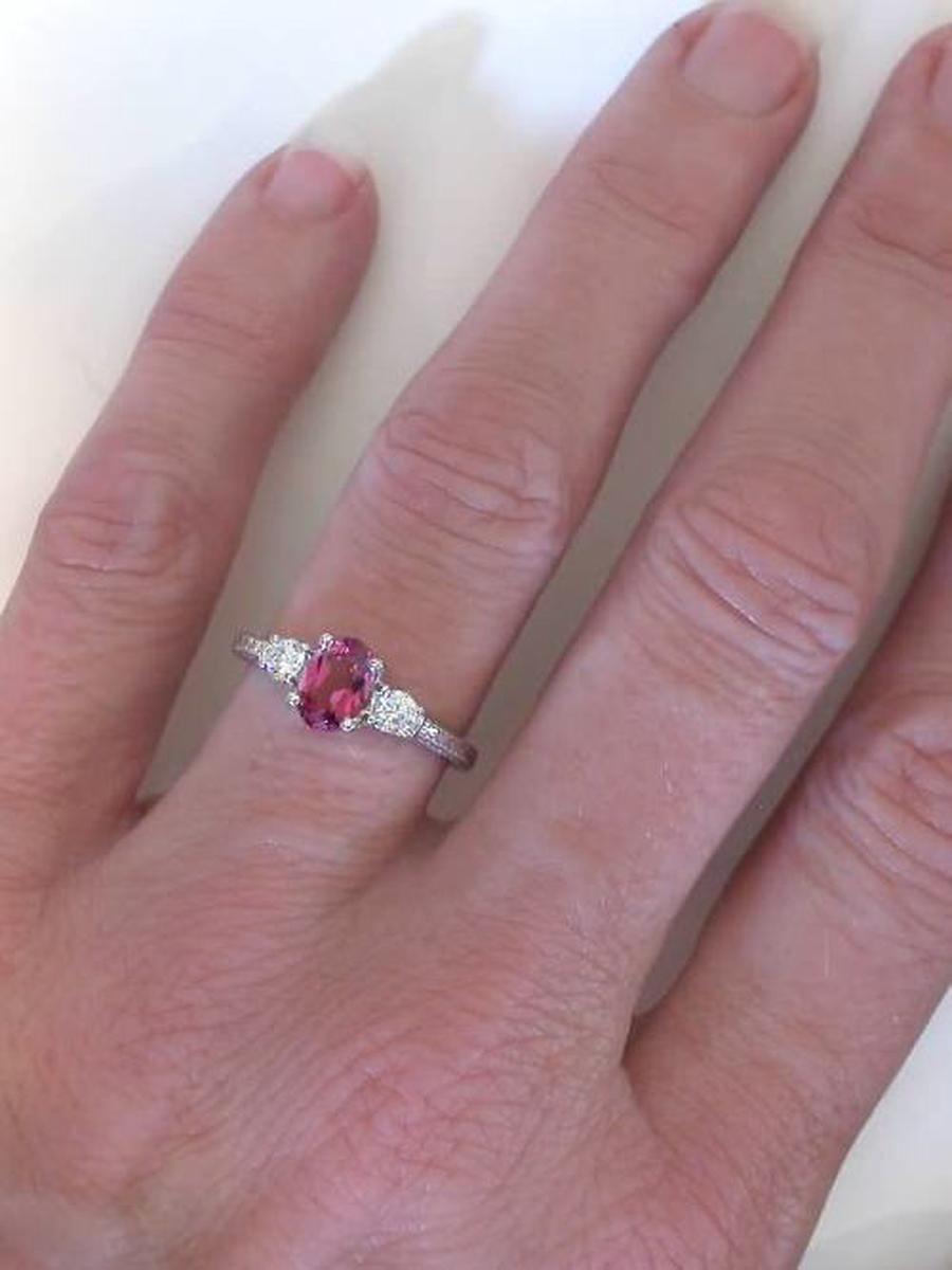 Oval Rhodolite Garnet and Real Diamond Three Stone Engagement Ring in solid 14k white gold for sale   Oval Cut Rhodolite Garnet and Real Round Diamond Three Stone Wedding Ring in solid 14k white gold for sale