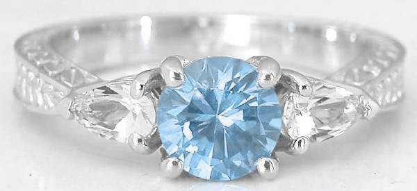 very lively gem. The fine quality aquamarine has a gorgeous sky blue color. On each side is a pear shaped white