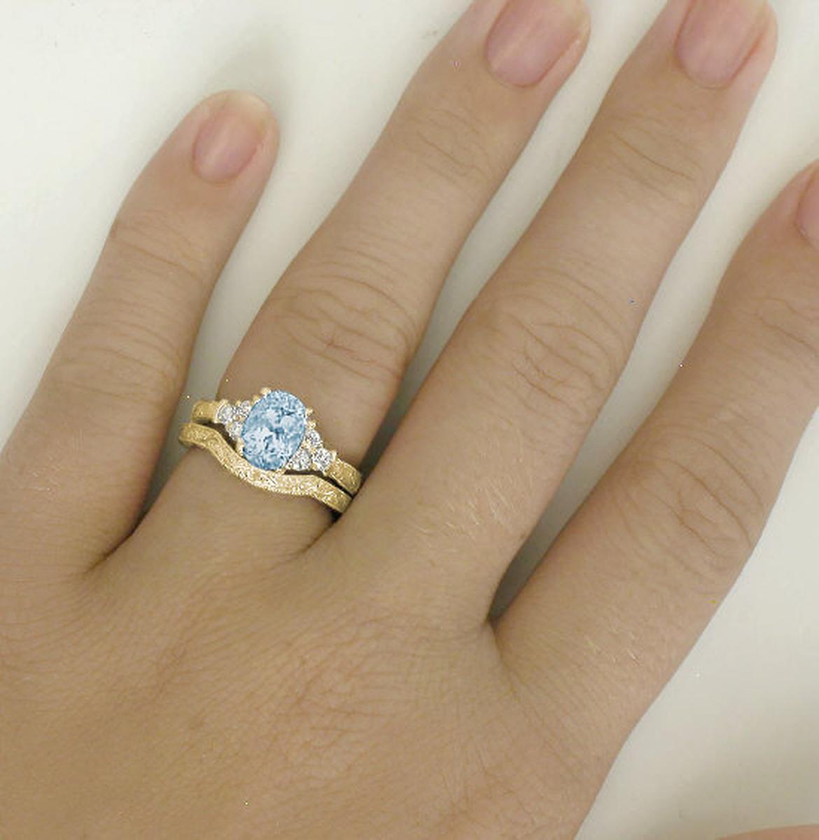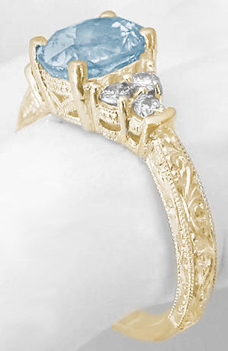 Engraved Aquamarine and Diamond Wedding Ring in 14k yellow gold   Vintage Aquamarine and Diamond Engagement Rings in 14k yellow gold