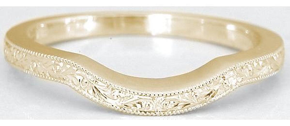 Special Features: A MJS Original Design:  This elegantly styled engagement ring features a gorgeous medium color aquamarine (rich sky blue) and three eye clean, white diamonds on each side. The diamonds add the perfect touch of tasteful sparkle to the ring.  But what we love most is the amazing engraving that adorns both rings. The engraving has a beveled floral scroll detail that extends about 3/4 of the way around the rings.  On the edges of the band and the baskets holding the gems, milgrain edging has been added to unify the vintage look. The optional matching band is contoured to sit close against the aquamarine ring.