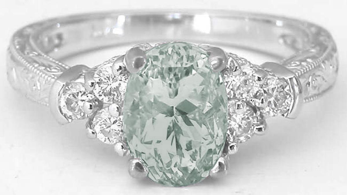 Special Features: A MJS Original Design:  This beautiful engagement ring is available only at MJS. We've taken a classic ring design and created a spectacular wedding set with the lovely green amethyst at the center, the elegant and ornate engraving on the shank, and the perfectly contoured and engraved wedding band to match. The green amethyst has a wonderful pastel celadon green hue and is complemented by three diamonds on each side. The truly special part of this set is the amazing engraving with scroll and floral details. From every angle, the rings are beautifully detailed; even the basket holding the green amethysts and diamonds are finished with engraving and milgrain detail.  The optional matching band is contoured to sit close against the green amethyst ring.