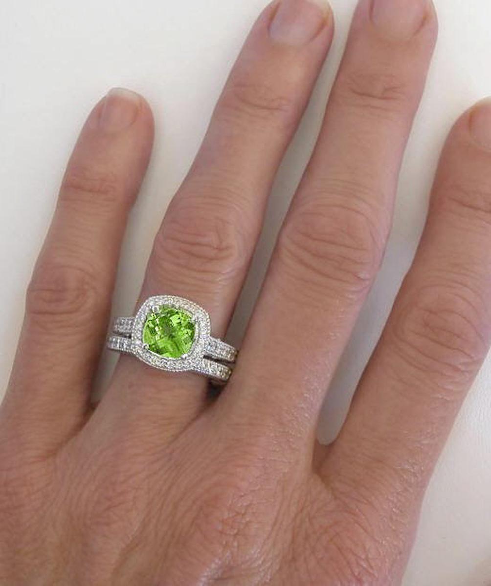 8mm Cushion Peridot and Diamond Halo Engagement Ring in 14k white gold   8mm Cushion Checkerboard Peridot and Diamond Halo Ring in 14k white gold