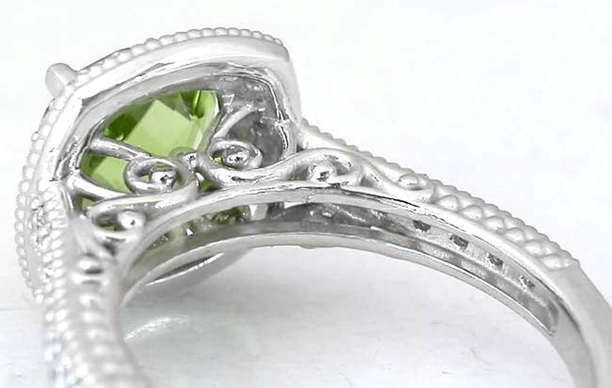 Special Features:Only at MJS! We just love this new ring style. A gorgeous eye catching center stone with the perfect touch of diamonds and unique detailing on the band. The peridot is a nice size at 8mm, 2.0 carats. It has a beautiful olive-apple green color, without strong yellowish overtones that is common in lower quality peridot. The peridot is eye clean and beautifully faceted with brilliant style facets on the pavilion (bottom) and checkerboard faceting on the crown (top). The diamond weight of the setting is right at 1/2 carat. Just enough to add the desired sparkle and wow factor but not so much that the ring is gaudy.  The ring has striking milgrain detail and filigree scroll work across the bottom of the peridot and then down the shank, there is complimentary beadwork so the ring is finished from every angle.  We think that with the combination of the beautiful peridot and the ornate ring detailing, this will be one ring that you just can't stop admiring on your finger!