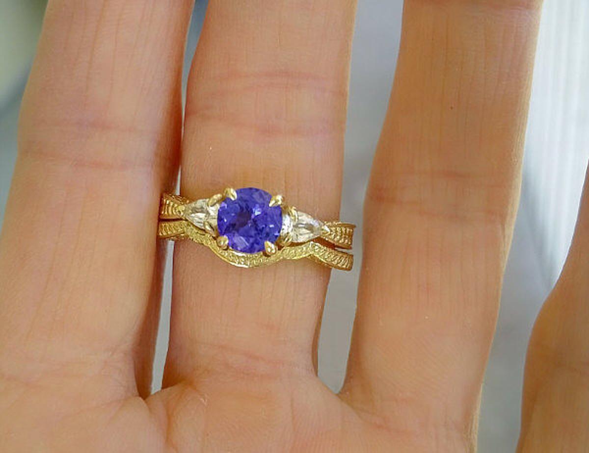 tanzanite ring. It is nicely contoured to sit flush against the engagement ring.