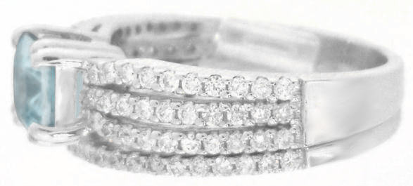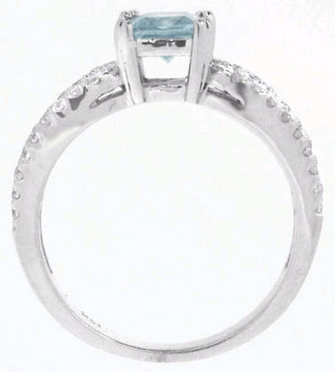 aquamarine is set between a backdrop of fine diamonds for a dazzling look.