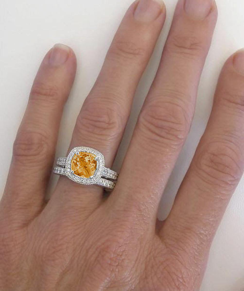Cushion Cut Citrine and Diamond Engagement Ring and Wedding Band   Cushion Cut Citrine Engagement Rings in 14k in 14k gold