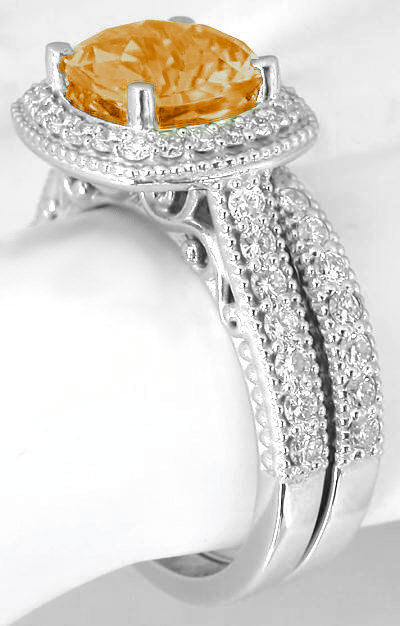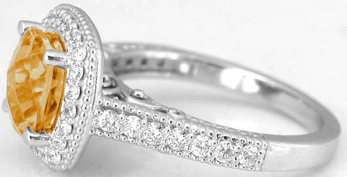 Special Features:Only at MJS! We just love this new ring style. A gorgeous eye catching center stone with the perfect touch of diamonds and unique detailing on the band. The citrine is a nice size at 8mm, 2.0 carats. It has a beautiful golden yellow-orange color. The color saturation is just perfect, not too light where the gem looks washed out and yellowish and not too intense where the gem begins to look dark and unappealing. The citrine is eye clean and beautifully faceted with brilliant style facets on the pavilion (bottom) and checkerboard faceting on the crown (top). The diamond weight of the setting is 1/2 carat. Just enough to add the desired sparkle and wow factor but not so much that the ring is gaudy or flashy.  The ring has striking milgrain detail and filigree scroll work across the bottom of the citrine and then down the shank, there is complimentary beadwork so the ring is finished from every angle.  We think that with the combination of the beautiful citrine and the ornate ring detailing, this will be one ring that you just can't stop admiring on your finger!