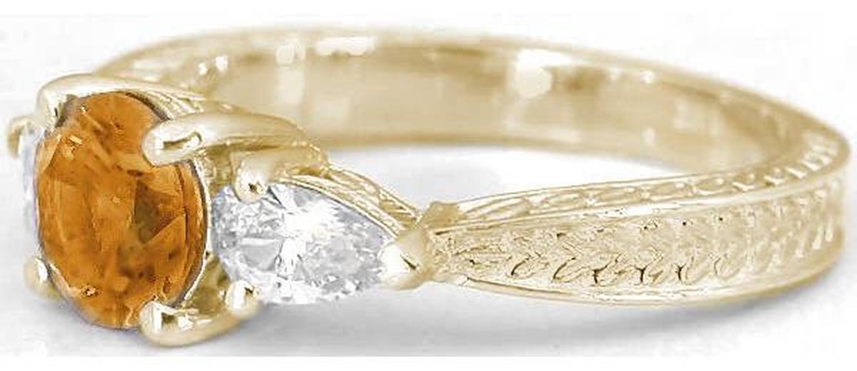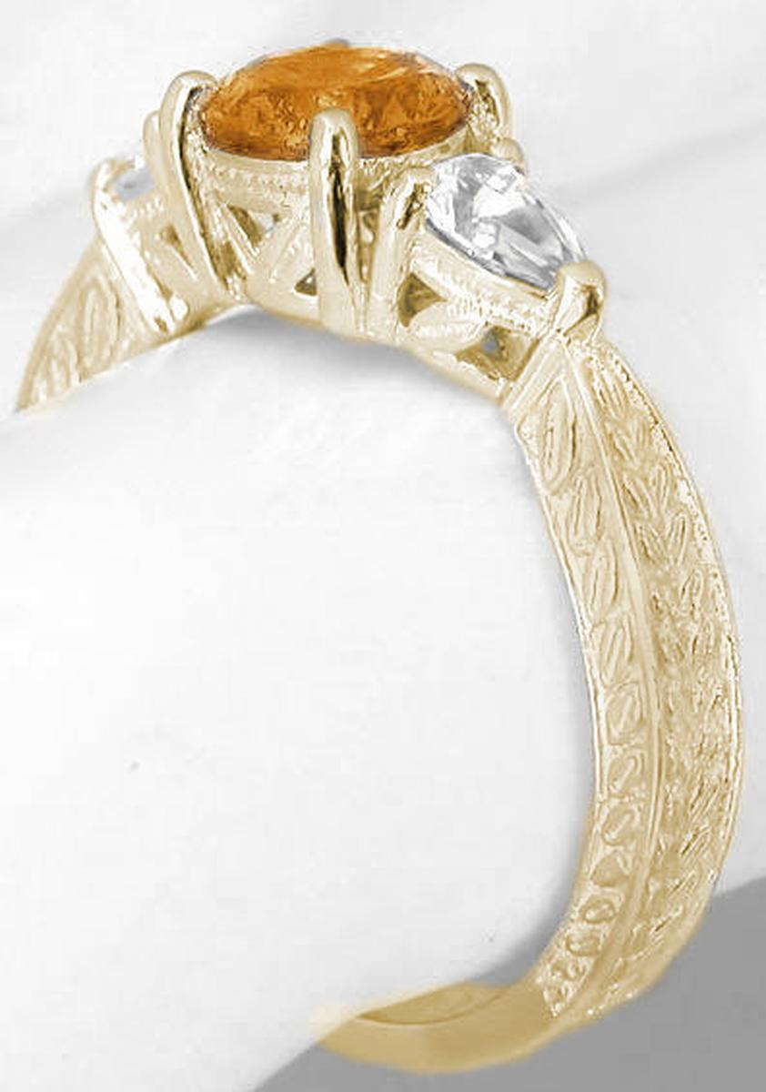 Special Features: A MJS Original Design:  We just love the combination of the fine quality citrine with the beautiful pear shaped white sapphires used in this classic past-present-future, or three-stone, ring. Such a traditional style but the unique pairing of the citrine and white sapphires creates a truly eye catching design.  The citrine is diamond cut with brilliant style (triangle shaped) faceting on the pavilion and crown. The faceting combined with the clarity makes for a very lively gem. On each side is a pear shaped white sapphire and the shank is done with engraving on three sides that extends toward the back.  The profile of the setting is low, making this a very comfortable and wearable design. The warmth of the 14k yellow gold setting nicely complements the hues in the beautiful citrine.