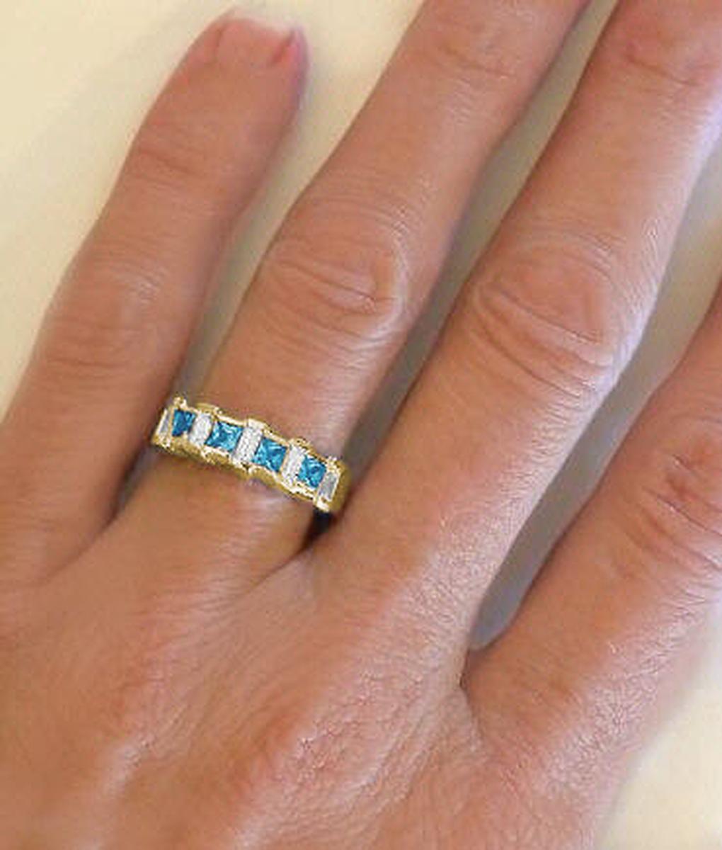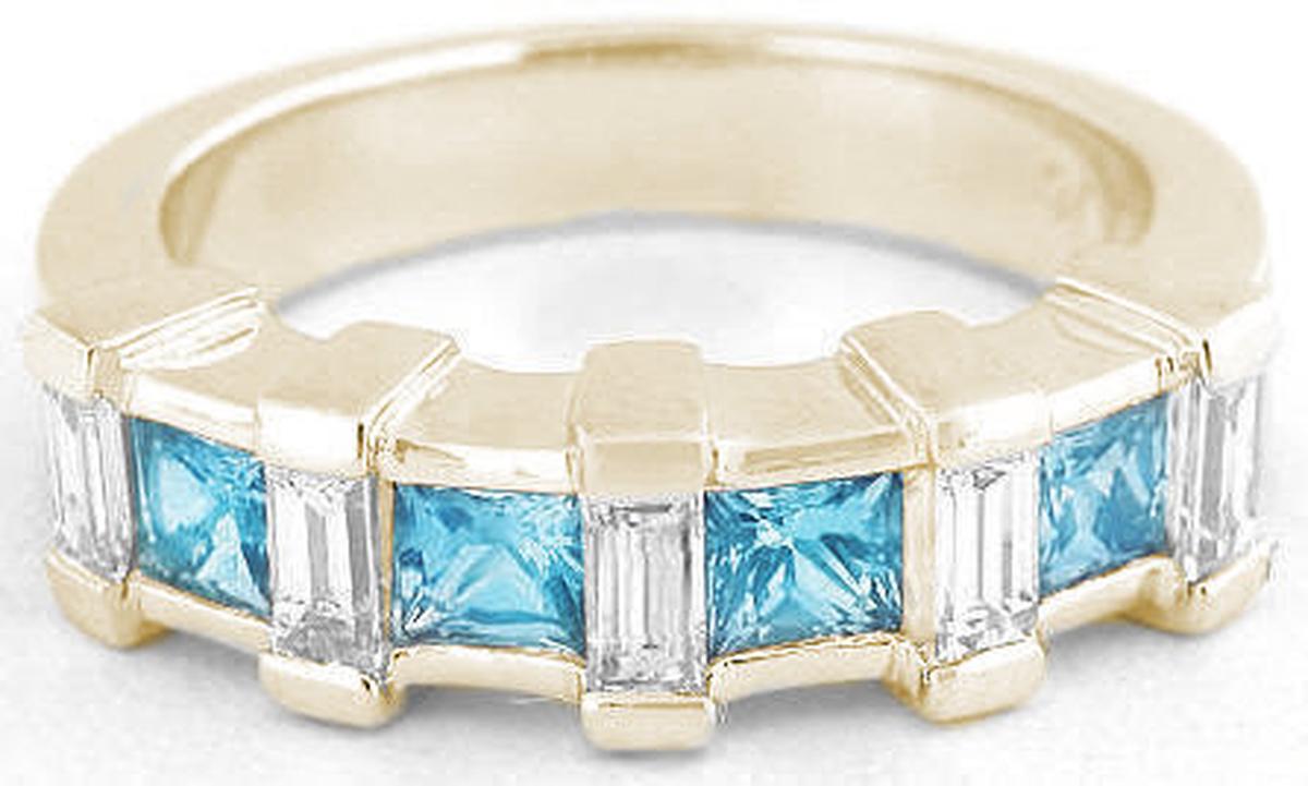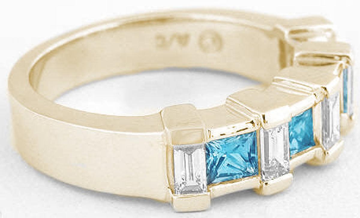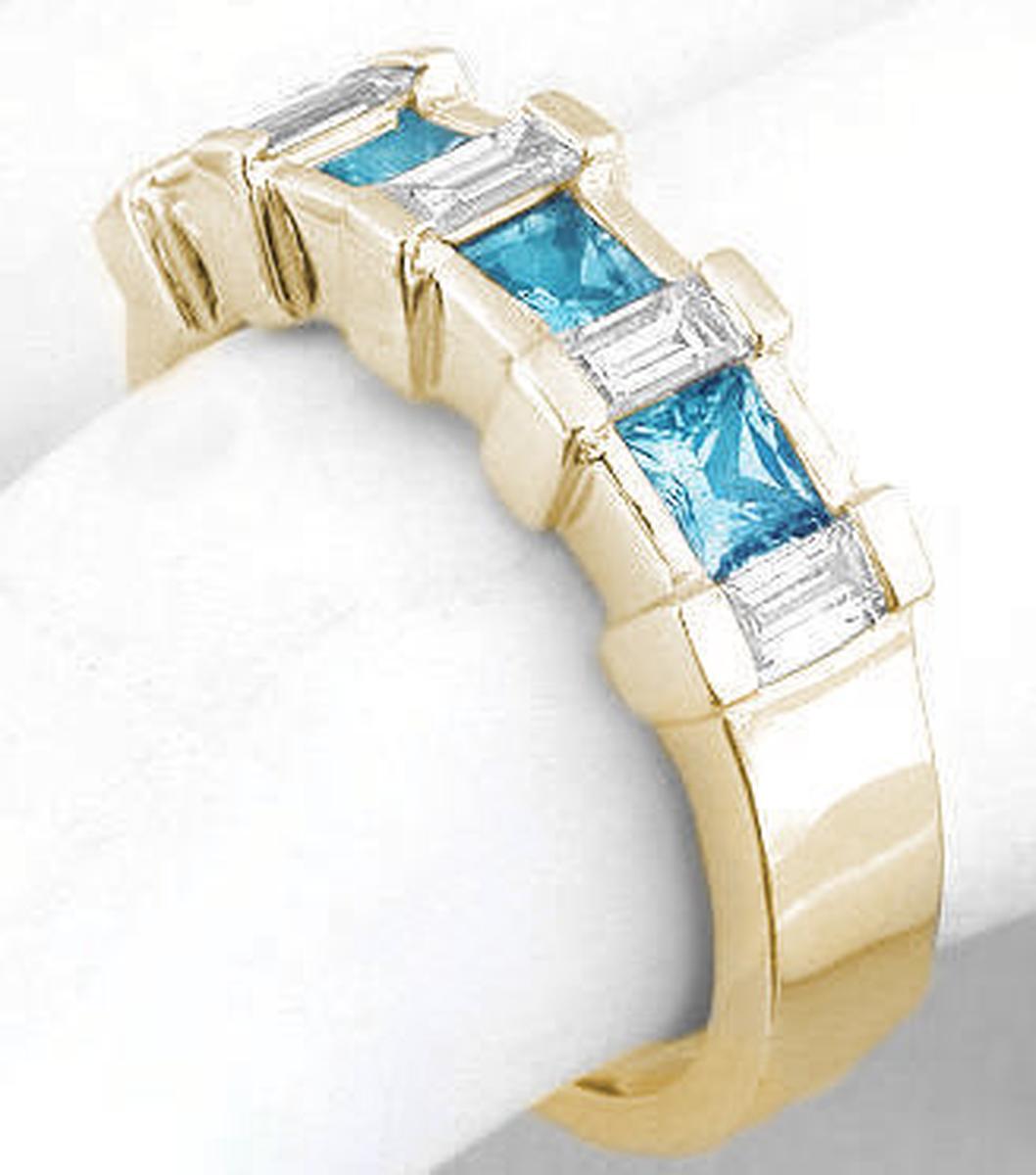 Special Features: Only at MJS! This band style ring has a bright, eye-catching look with princess cut Swiss Blue Topaz gemstones combined with classic baguette diamonds. The Swiss Blue Topaz, the birthstone for December, has an inviting classic color and the princess cutting of the stones allows for maximum brilliance and sparkle. Elegant baguette diamonds are set in between for a graceful look. The diamonds are of very fine quality, near colorless and better than eye clean and add an element of refinement to the ring. The 14k yellow gold setting is substantial and has a certain weight to it that feels wonderful on the finger, and the ring will easily stand up to a lifetime of daily wear. Consider this piece as an anniversary ring, birthstone ring or promise ring. It is so versatile and comfortable that we know it will not spend much time in your jewelry box!