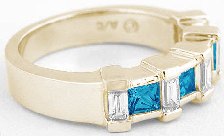 Special Features: Only at MJS! This anniversary band style ring has a fresh new look with princess cut London blue topaz gemstones combined with classic baguette diamonds. The London Blue Topaz, the birthstone for December, has a rich classic color and the princess cutting of the stones allows for maximum brilliance and sparkle. Elegant baguette diamonds are set in between for a graceful look. The diamonds are of very fine quality, near colorless and better than eye clean and add an element of refinement to the ring. The 14k yellow gold setting is substantial and has a certain weight to it that feels wonderful on the finger, and the ring will easily stand up to a lifetime of daily wear. Consider this piece as an anniversary ring, birthstone ring or promise ring. It is so versatile and comfortable that we know it will not spend much time in your jewelry box!