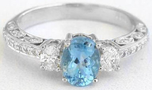 Special Features: The elegant, antique style of this ring is complemented beautifully by the soft dreamy color of the aquamarine at the center. The color of this particular aquamarine is an inviting sky blue color which is contrasted nicely by the bright white oval diamonds and the white gold band covered in bead set diamonds. The intricate detail of the band is feminine and the ring has the feel of a true heirloom piece. We love this ring for the right hand, perhaps a birthstone ring, but we also think that this would make a wonderful engagement ring for the person who wants something truly unique.