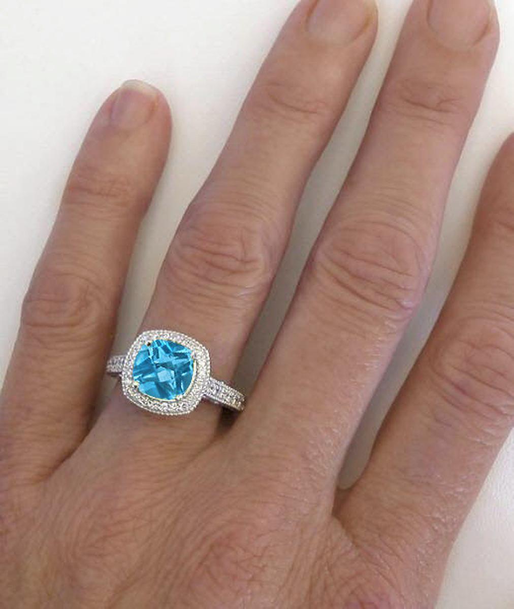 Cushion cut halo checkerboard faceted swiss blue topaz band ring in 14k gold   Swiss Blue Topaz Diamond Rings in 14k gold