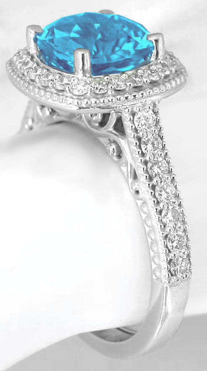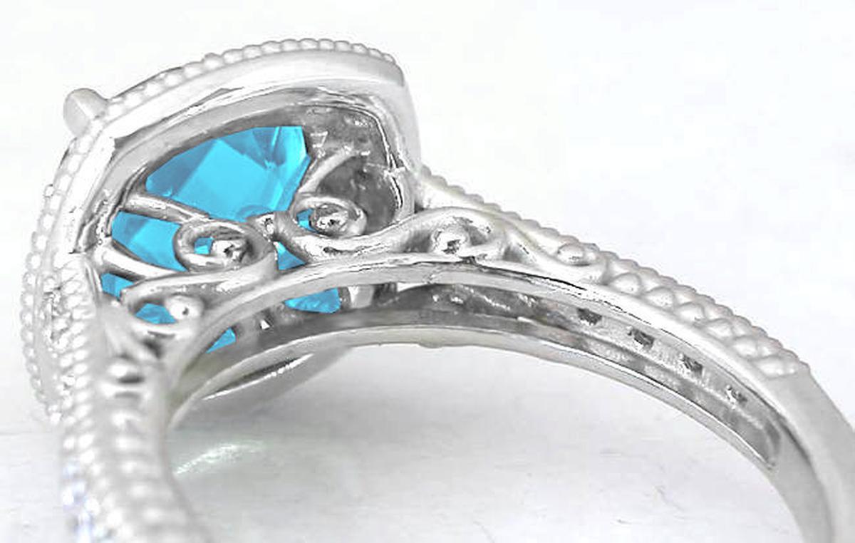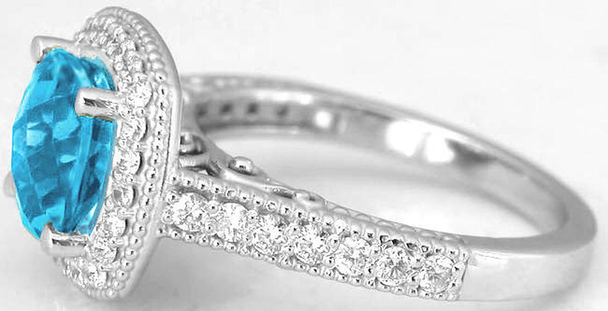 Special Features: Only at MJS! We just love this new ring style. A gorgeous eye catching center stone with the perfect touch of diamonds and unique detailing on the band. The topaz is a nice size at 8mm, 2.5 carats.  It has a gorgeous Swiss Blue color.  The topaz is eye clean and beautifully faceted with brilliant style facets on the pavilion (bottom) and checkerboard faceting on the crown (top). The diamond weight of the setting is 1/2 carat. Just enough to add the desired sparkle and wow factor but not so much that the ring is gaudy or flashy.  The ring has striking milgrain detail and filigree scroll work across the bottom of the topaz and then down the shank, there is complimentary beadwork so the ring is finished from every angle.  We think that with the combination of the beautiful topaz and the ornate ring detailing, this will be one ring that you just can't stop admiring on your finger!