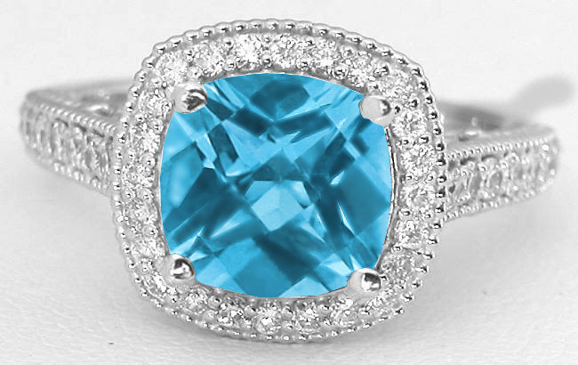 Green Amethyst Cushion Diamond Halo Ring  Ornate Beaded 2.50 ctw Cushion Aquamarine and Diamond Ring in 14k white gold  November Birthstone Citrine Diamond Rings  Garnet and Diamond Halo Rings in White Gold  2.90 ctw 8mm Cushion  Peridot and Diamond Haol Ring in 14k white gold    Cushion Cut Tanzanite and Diamond Halo Ring in 14k white gold  London Blue Topaz Cushion Rings
