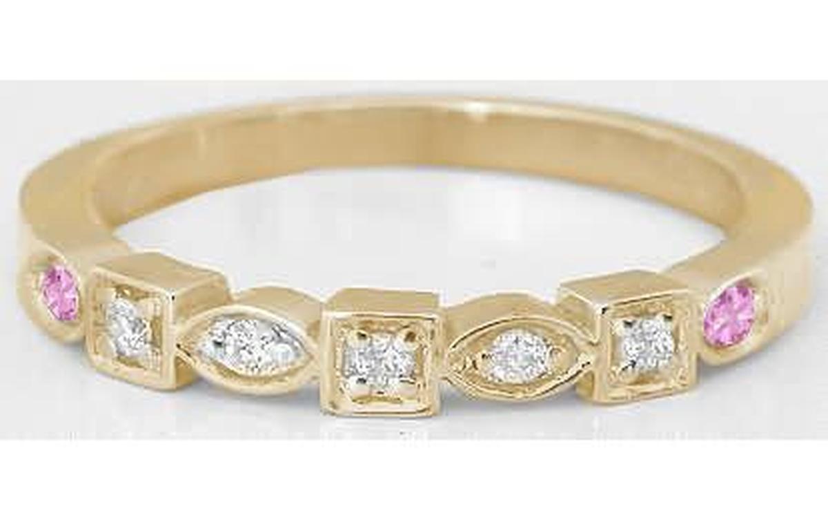 engagement ring features both blue and pink sapphires. The sapphire is a radiant