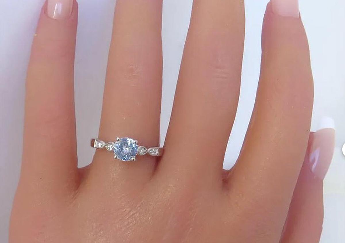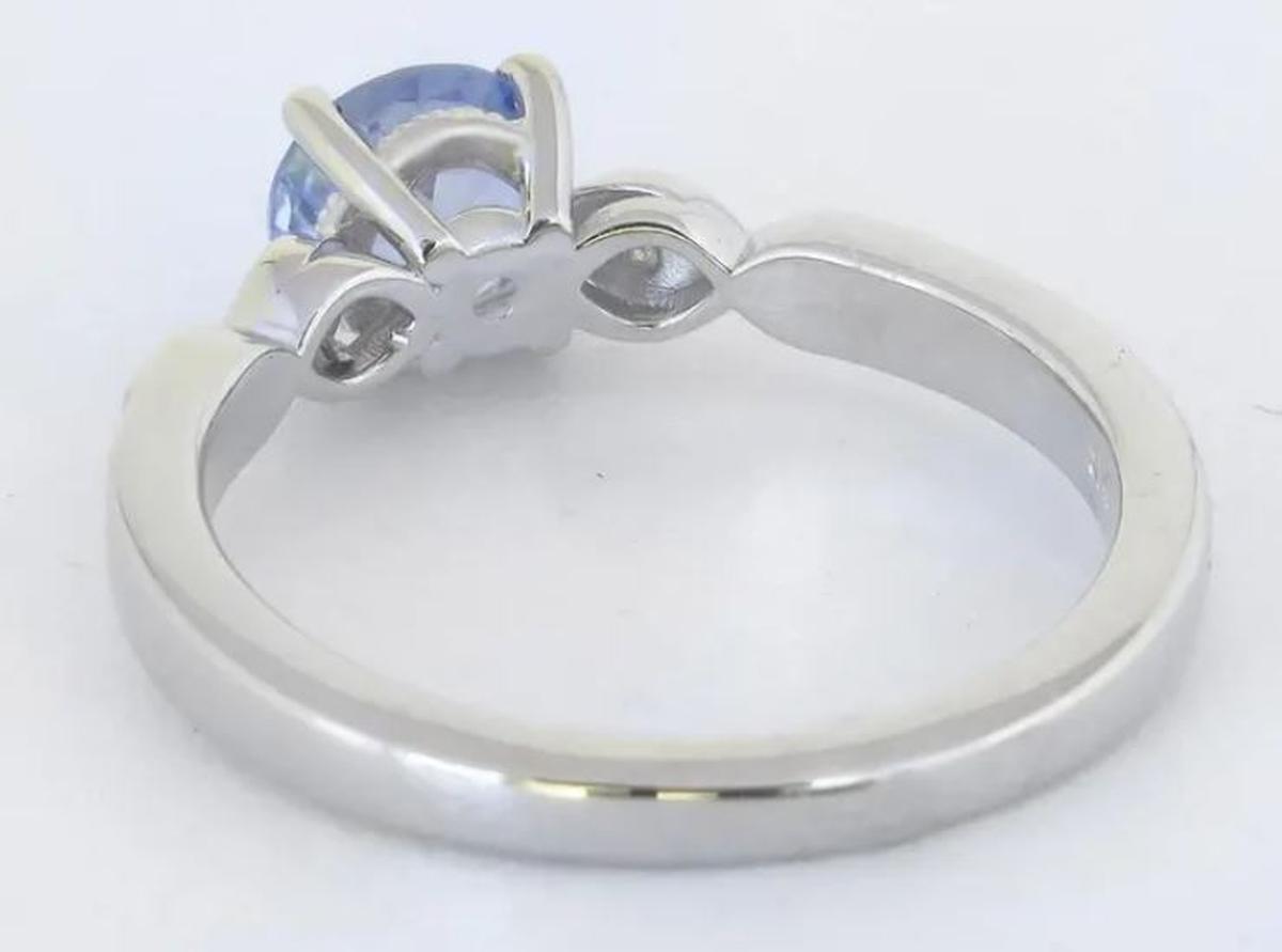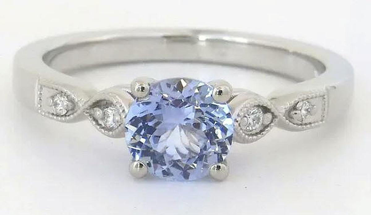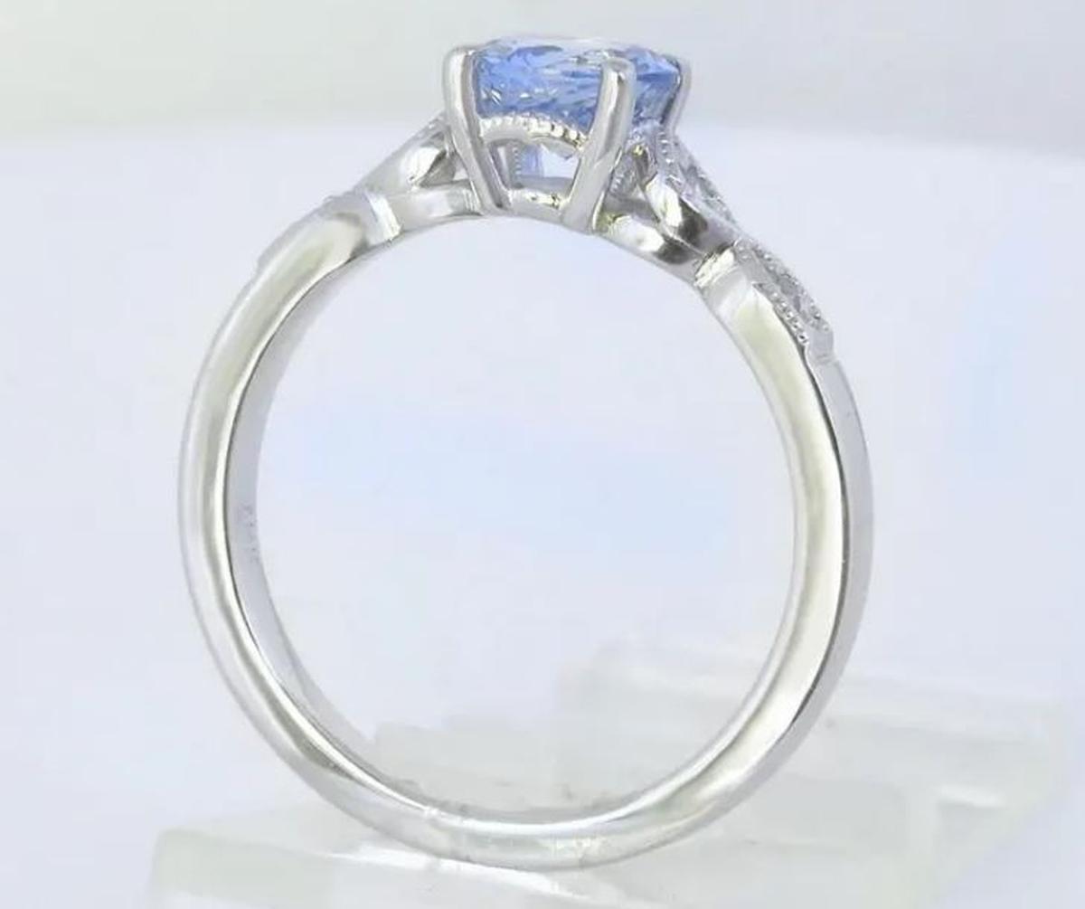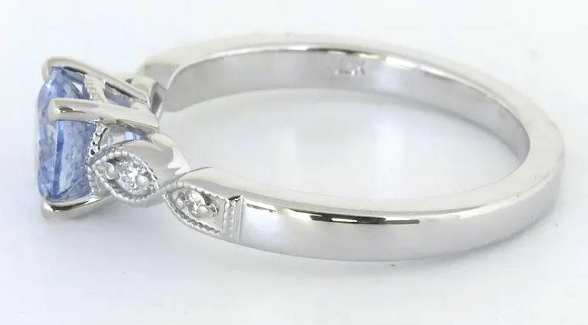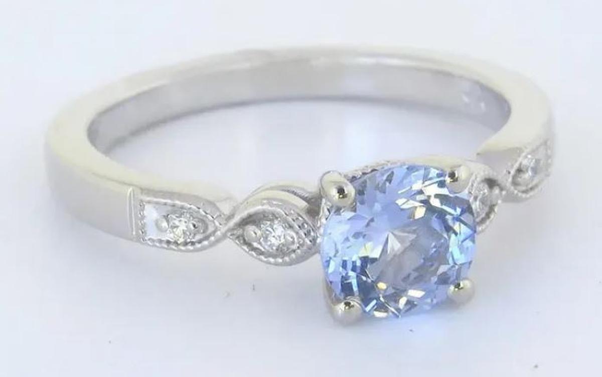 With its soft, luminous sapphire and vintage-inspired details, this ring is both distinctive and elegant. At its center is a 1.02ct round Ceylon sapphire (6.1mm), displaying a mesmerizing very light cornflower blue with a hint of periwinkle - soft, ethereal hue