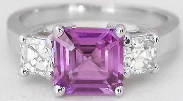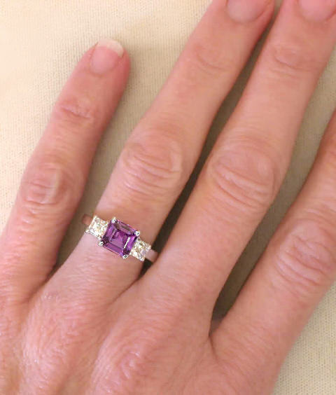 Special Features: This fabulous ring is all about the unique shape and color of the sapphire. This magenta sapphire has a square cut and such a lovely hue. We very rarely see sapphires that are the perfect combination of pink and purple. The sapphire has great saturation and color uniformity and is eye clean. We have taken a gorgeous pair of 3.5mm princess cut white sapphires and set one on either side. This classic three stone ring is perfect as an engagement ring or a right hand ring. Sapphires are a hard and durable gemstone and are great for a ring that will be worn and enjoyed every day. And we set the stones in the most precious of metals, platinum. The setting too is durable and will last a lifetime. Platinum is a naturally white metal so the ring will look as good in thirty years as it does the day you receive it.