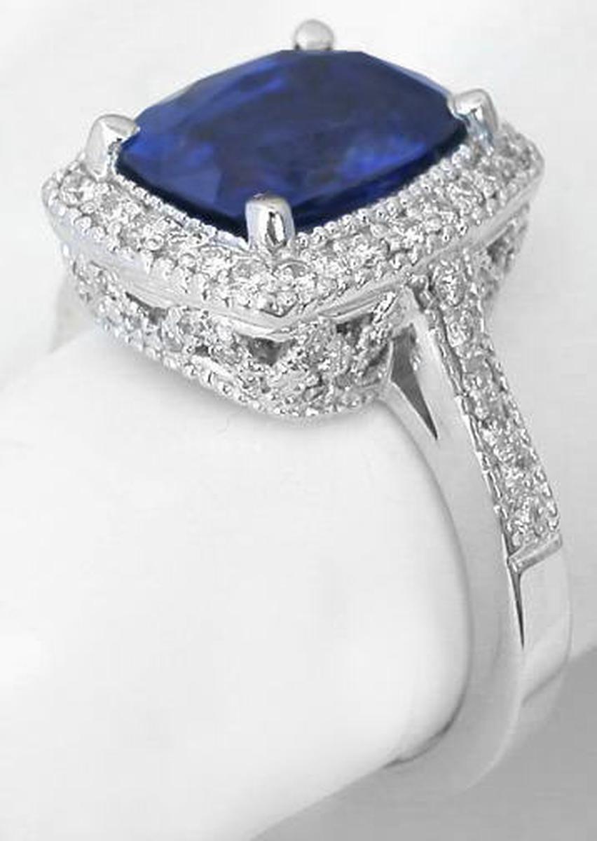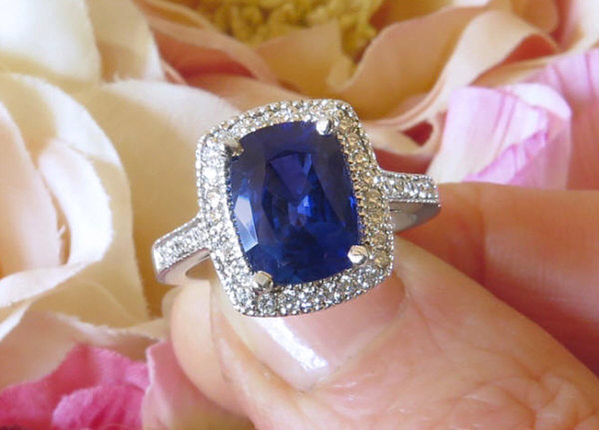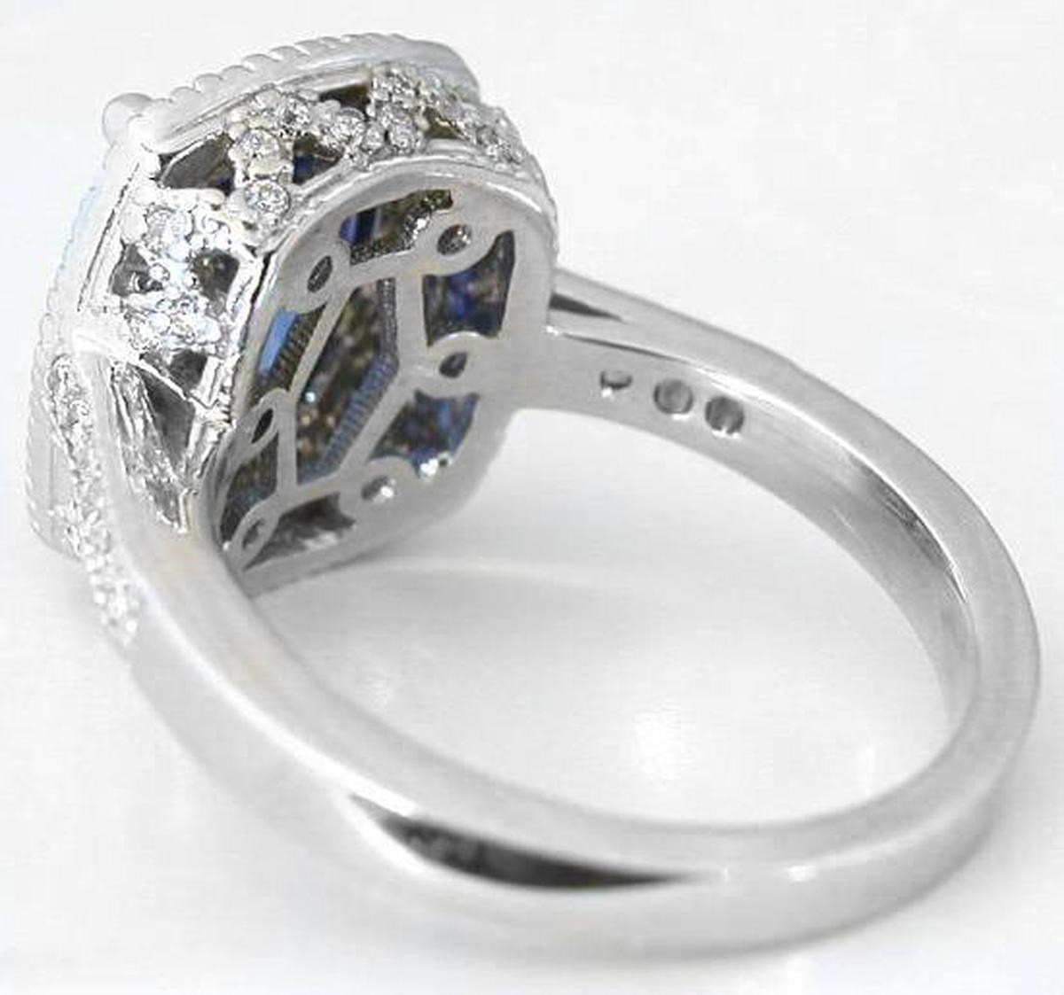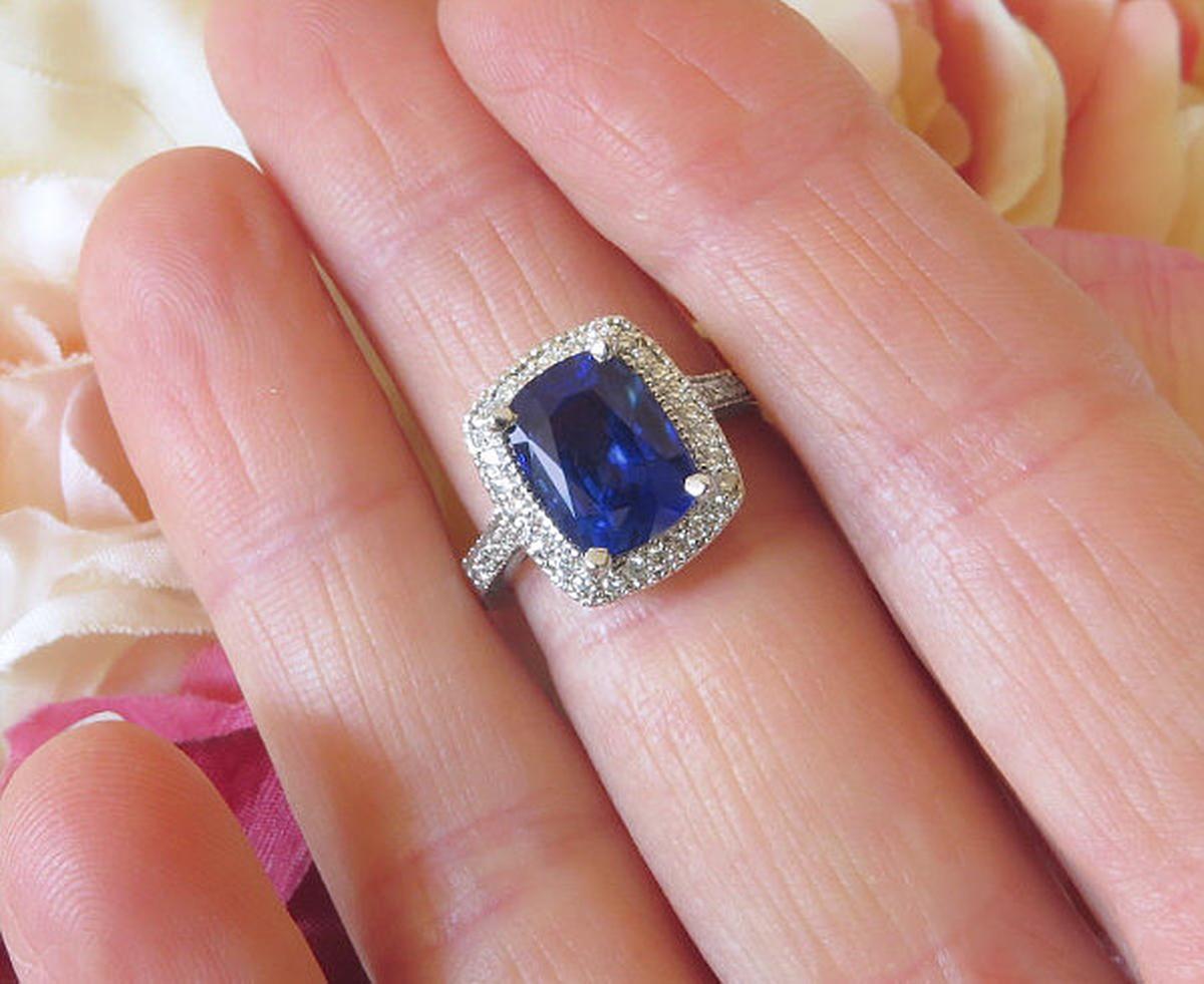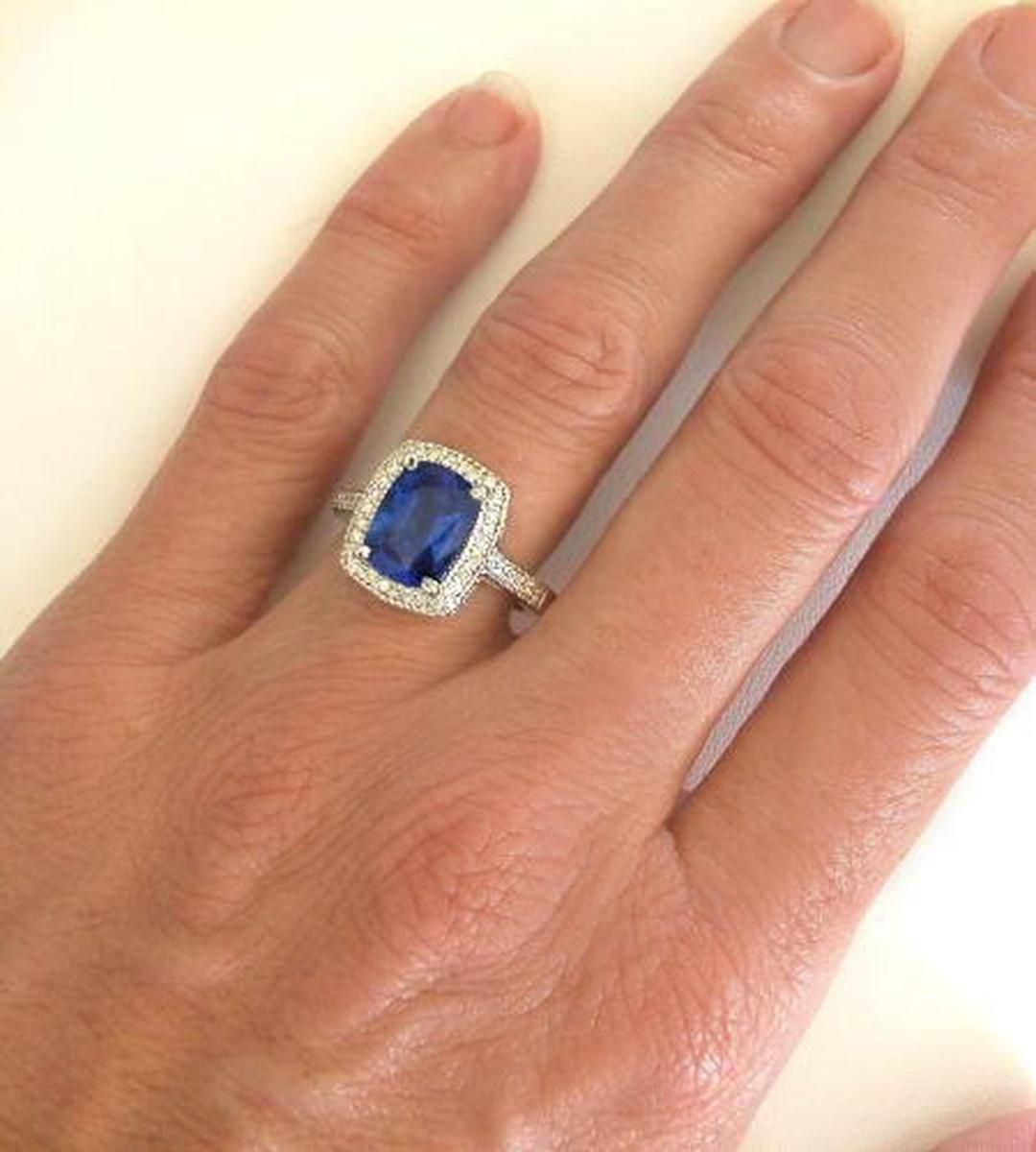 Large Cushion Natural Blue Sapphire and Real Diamond Engagement Ring in 18k white gold for sale   Large Cushion Natural Blue Sapphire Ring with Real Diamond Halo in 18k white gold   Over 3 carat Ceylon Blue Sapphire and Diamond Engagement Ring in 18k