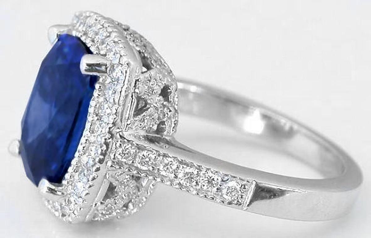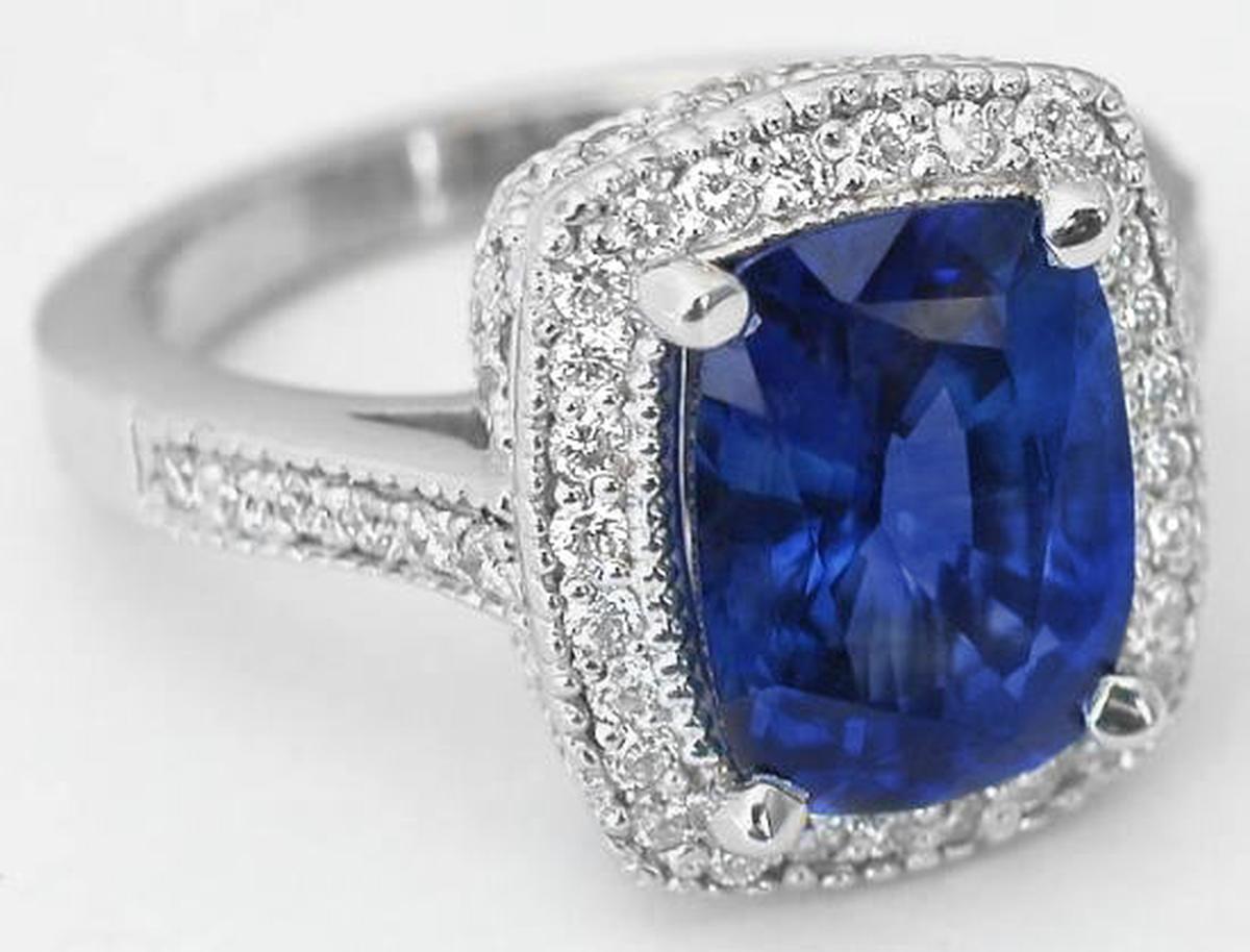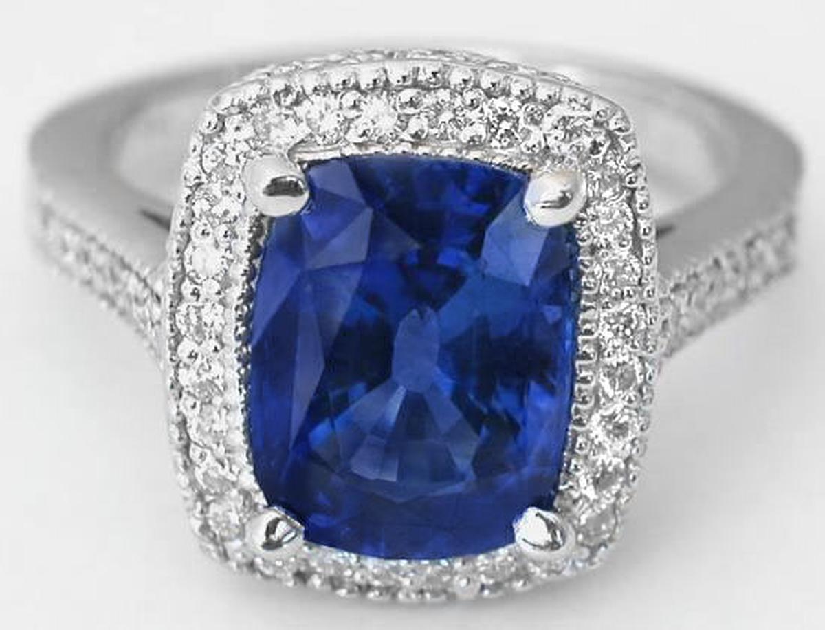 Special Features: The intense vivid cornflower blue colors in Ceylon sapphires are very rare and whenever we come across one, we always consider it for our fine collection of sapphire rings. When we found this sapphire, we were first mesmerized by the color. The cutting and clarity are superb as well, particularly given the size of the gem. Fine quality gem material is cut very sparingly to preserve the overall weight of the gem and it's often that we see beautiful colored sapphires with inferior cuts. But this amazing gem is an exception. It has a very nice cut and is not too deep (so you're not paying for weight you can't see!). The sapphire is nearly loupe (10x magnification) clean and this is evident in the transparency and sparkle you see when the facets catch the light. We think that you truly will be 'wowed' by this sapphire. It is framed with very fine quality round diamonds with a milgrain edging. The intense color of the sapphire contrasts beautifully with the 18k white gold setting and the amazing color just pops. Additional diamonds are set in the detailed gallery beneath the stone and down the band. The gold weight is a significant 7 grams which means that this ring hold up beautifully to daily wear and it will be extremely comfortable on the finger.  This ring would make a stunning engagement ring for the lady who prefers a more substantial center stone. Or consider this for the right hand too; it will make quite a statement!