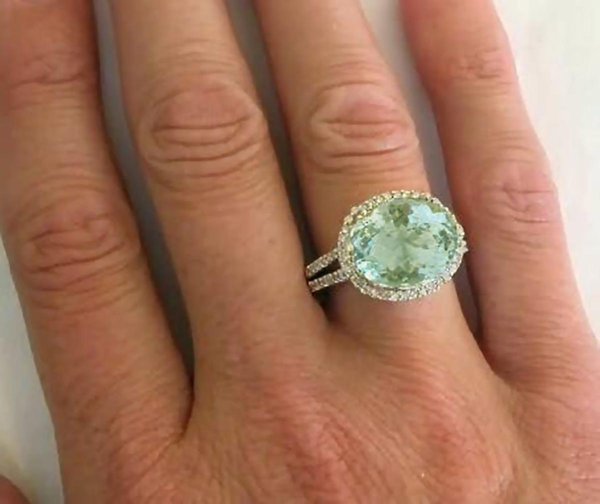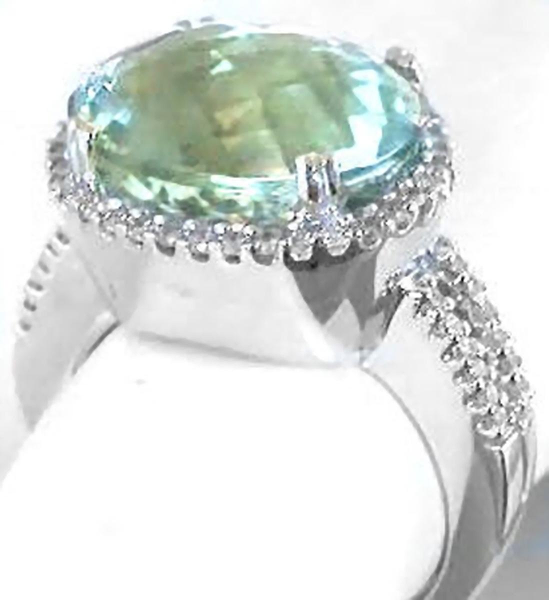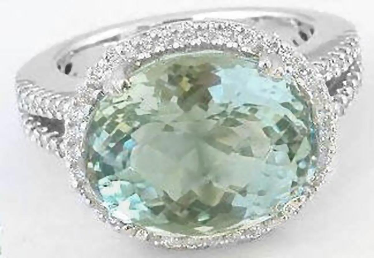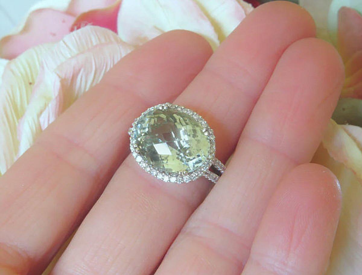 Special Features: The green amethyst is such a hot stone right now and is justifiably popular because it can be worn with just about any color. It is a different type of neutral that is pretty on any skin tone and the sparkle will make people take a second look. This ring features an east-west set oval center surrounded by fully faceted round diamond and a split shank, also adorned with diamonds. Notice how substantial the setting appears with the solid 14k white gold basket that holds the amethyst and the band has a nice thickness to it so you can tell this is a high quality piece of jewelry.