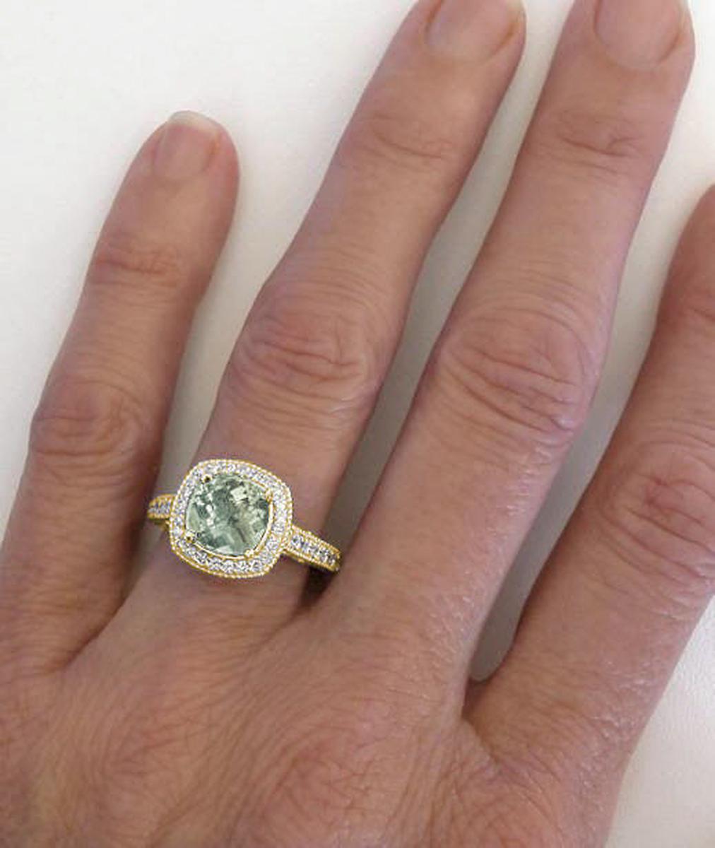 2.50 ctw Cushion Cut Prasiolite and Diamond Ring in 14k yellow gold