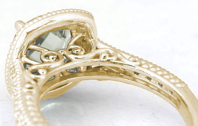 Special Features: Only at MJS! We just love this new ring style. A gorgeous eye catching center stone with the perfect touch of diamonds and unique detailing on the band. The green amethyst is a nice size at 8mm, 2.0 carats. It has a delicate minty green color. The color saturation is just perfect, not too light where the gem looks washed out and not too intense where the gem begins loses its softness. The green amethyst is eye clean and beautifully faceted with brilliant style facets on the pavilion (bottom) and checkerboard faceting on the crown (top). The diamond weight of the setting is 1/2 carat. Just enough to add the desired sparkle and wow factor but not so much that the ring is gaudy or flashy.  The ring has striking milgrain detail and filigree scroll work across the bottom of the green amethyst and then down the shank, there is complimentary beadwork so the ring is finished from every angle.  We think that with the combination of the beautiful green amethyst and the ornate ring detailing, this will be one ring that you just can't stop admiring on your finger!