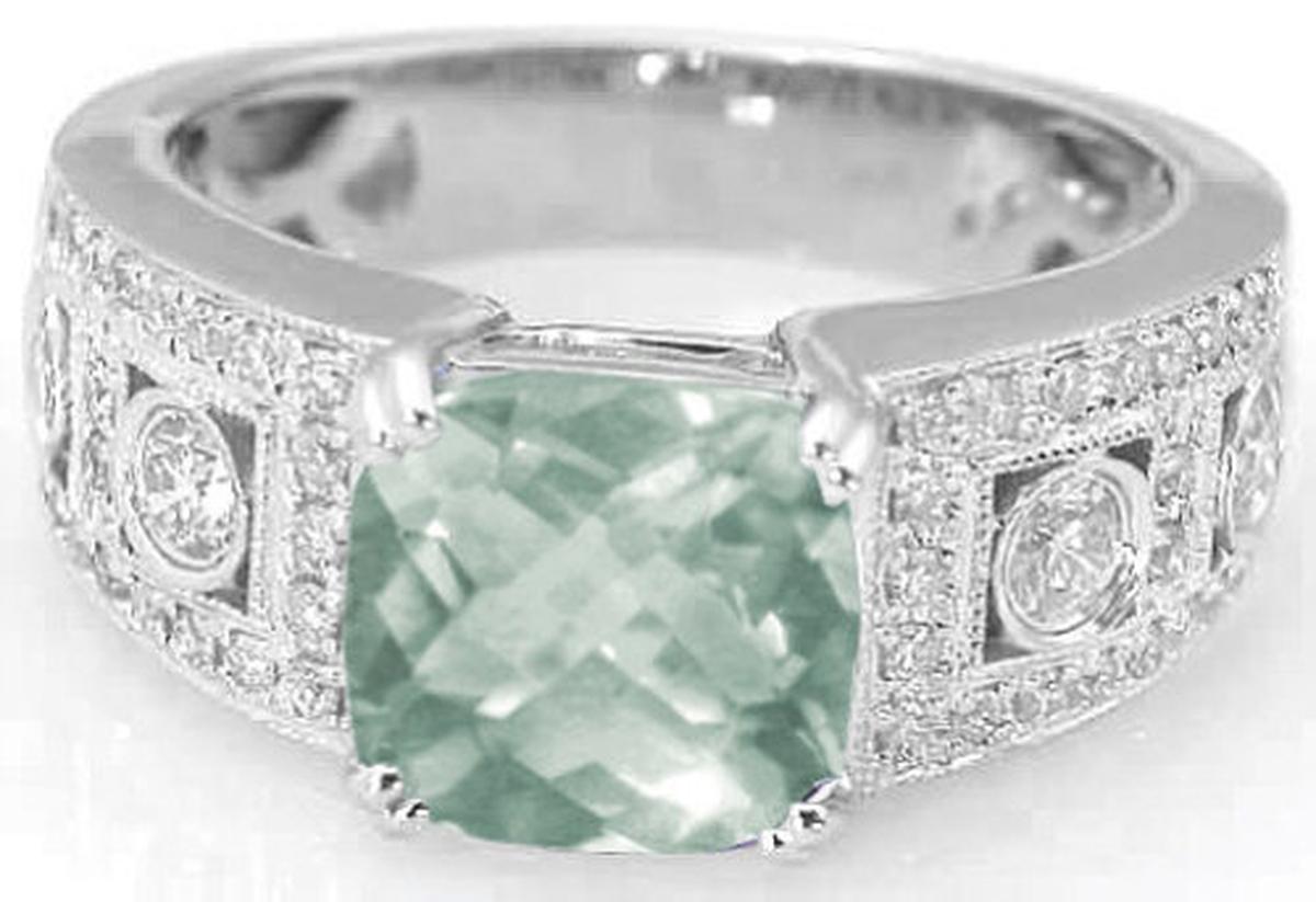 Cushion Cut Prasiolite and Diamond Wide Band Ring   8mm Cushion Cut Prasiolite and Diamond Wide Band Ring