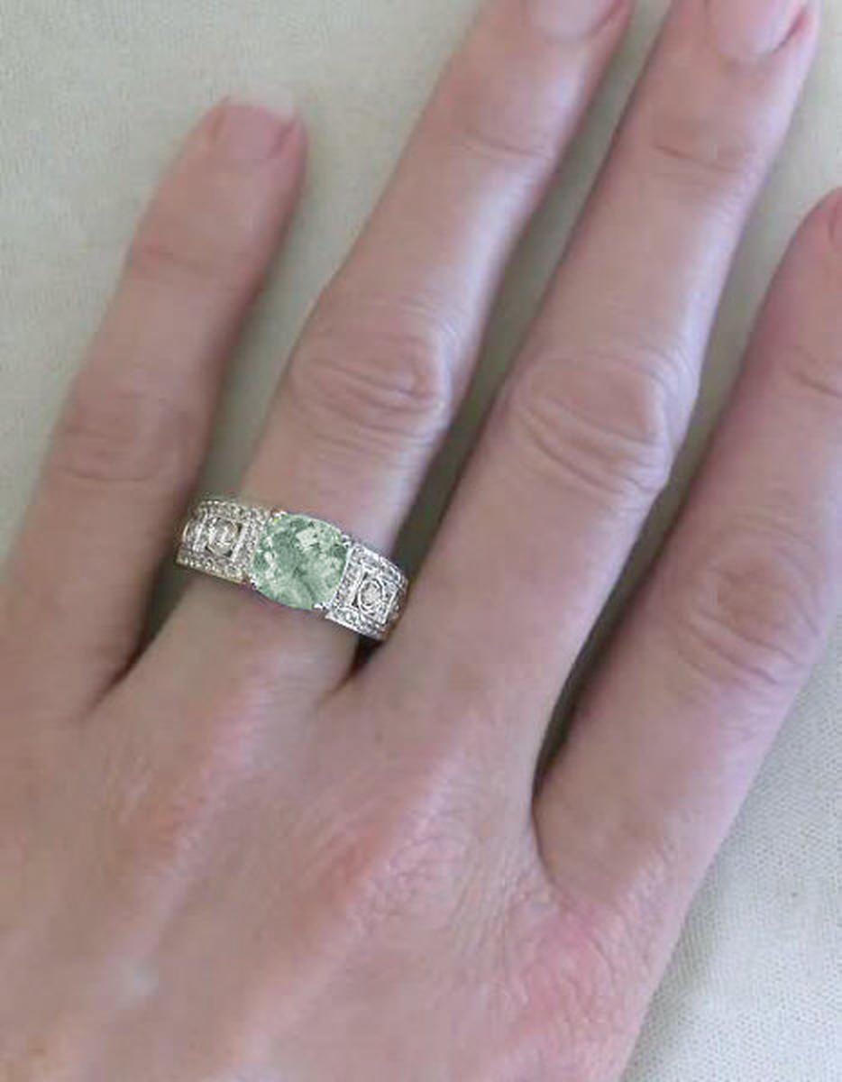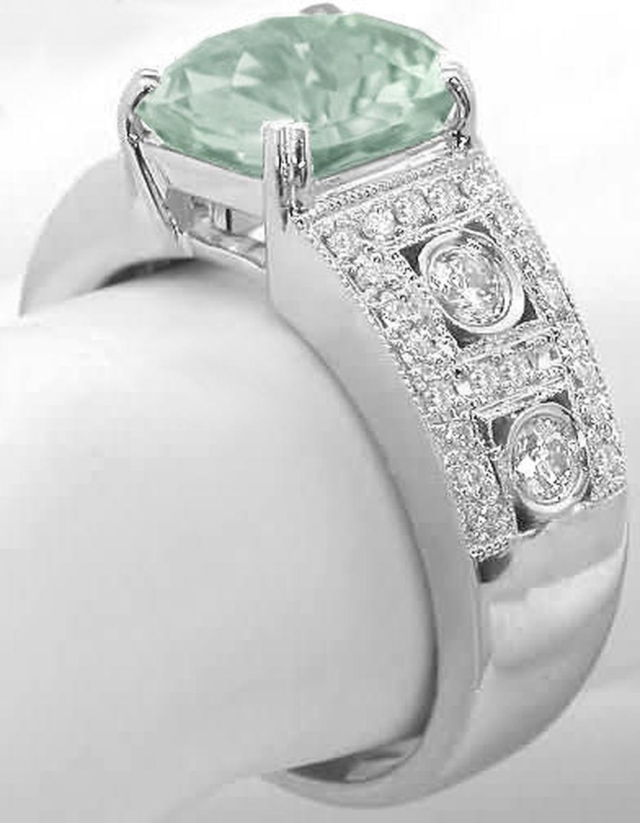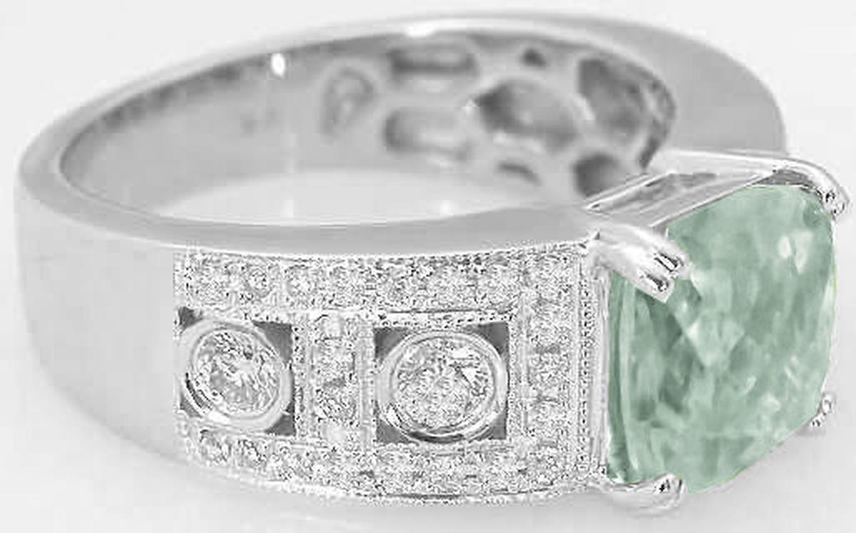 Special Features: This gorgeous band ring style is ideal for the ladies who prefer a more substantial yet wearable design. The wide band styling allows the center stone to be set fairly low so this ring will be great for every day wear.  The green amethyst at the center weighs 2.0 carats and is 8mm (checkerboard faceted top) in size. It has a soft delicate green hue and is eye clean. The setting has a certain vintage or antique feel to it because of the bead set diamonds and milgrain edging. Two bezel set round diamonds are highlighted on each side. The gram weight is substantial and you can feel the quality when it is on your finger. We've even added a beautiful undergallery which makes this ring extremely comfortable too.