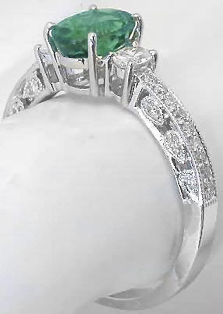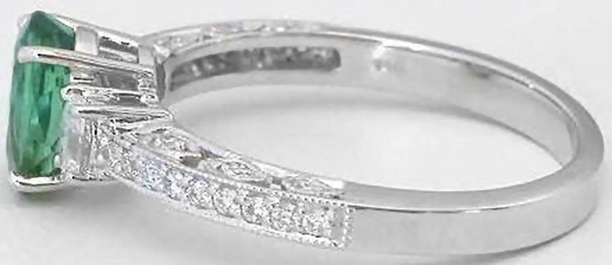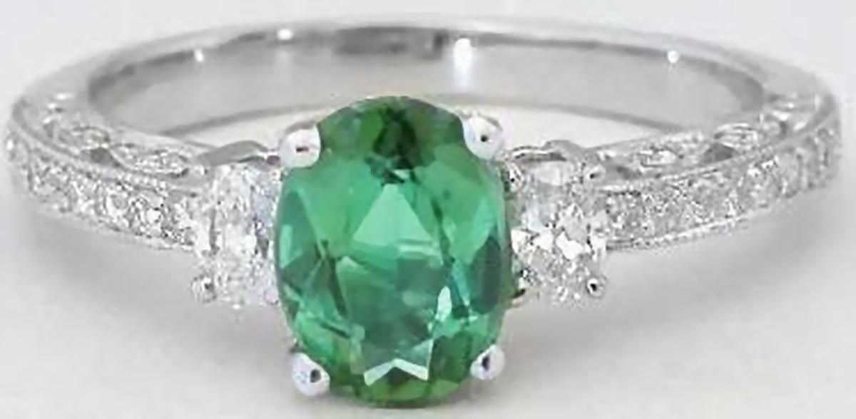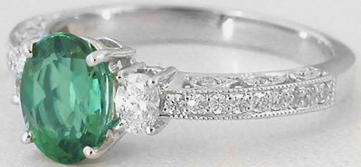 Special Features: For those of you who love antique styled jewelry, this elegant ring is a perfect choice. The ring features a stunning seafoam green tourmaline with an inviting medium minty-olive green color. It is eye clean and just dazzles between the oval diamonds on either side. Beautiful antique styling, milgrain edging and bead set diamonds finish the look. This ring would make a perfect engagement ring since we also have a matching band available. Or, what a delicate feminine piece for the right hand.  Truly a classic to be cherished for a lifetime.