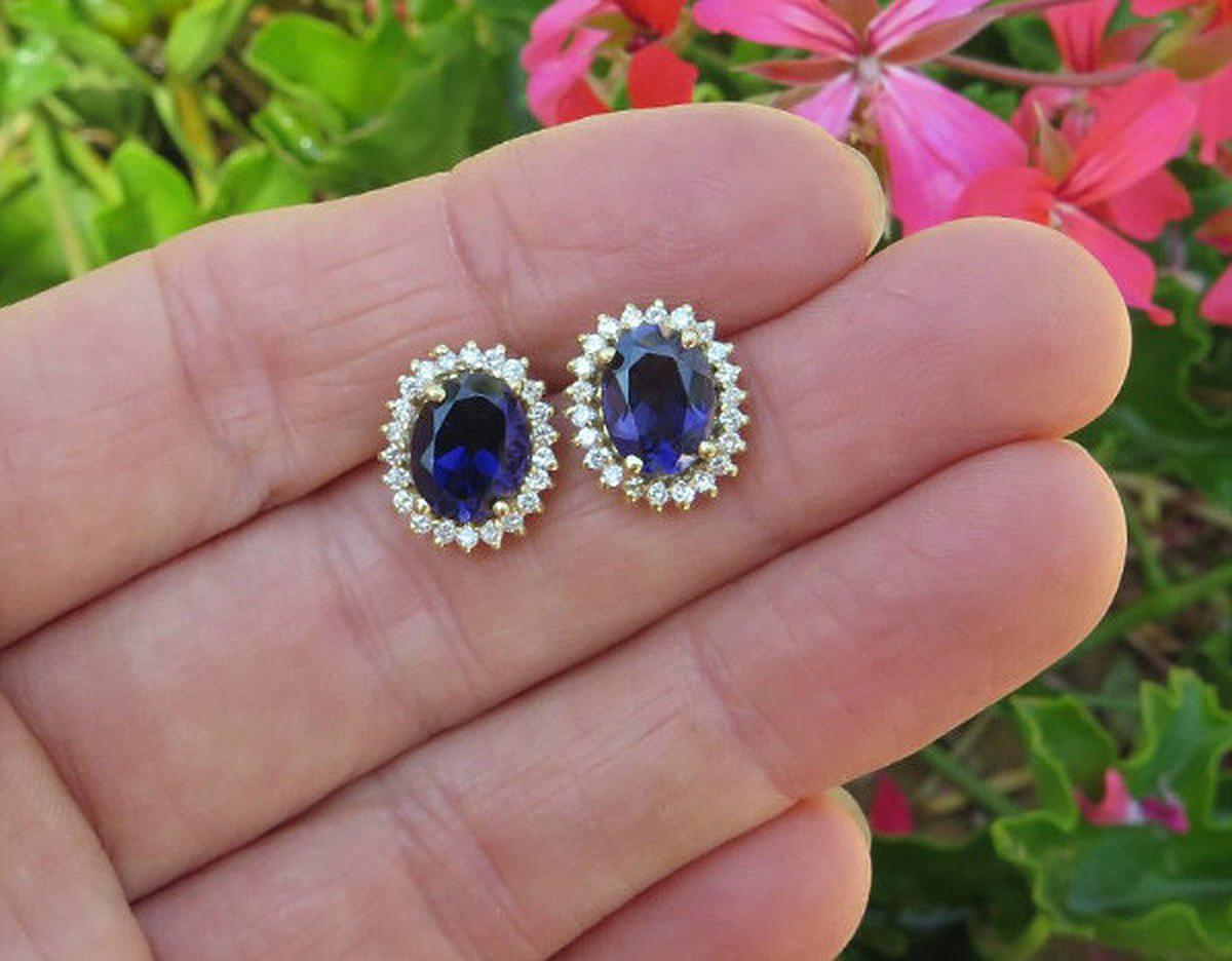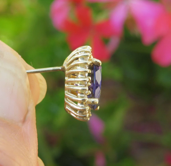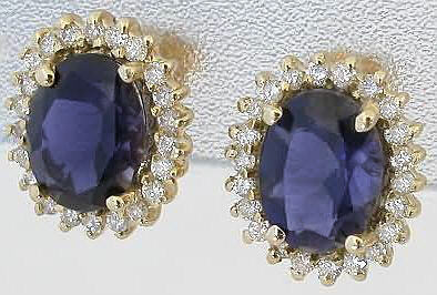 Oval Iolite Stud Earrings with Diamond Halo in solid 14k yellow gold   Iolite Stud Earrings with Diamond Halo in 14k yellow gold basket