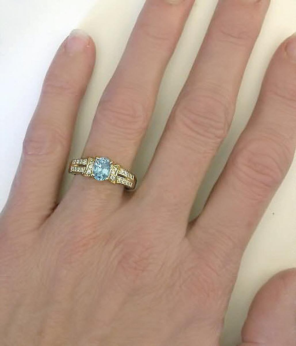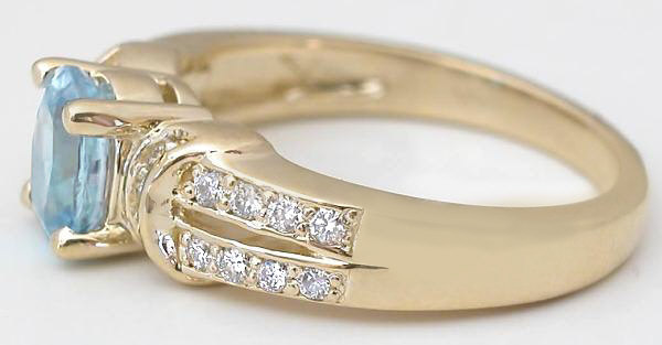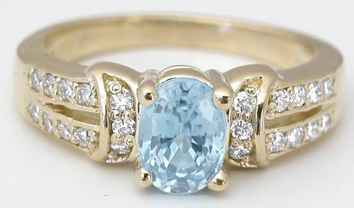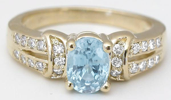 aquamarine is set in a split shank design ring outlined with clean, white bead set diamonds on each side for