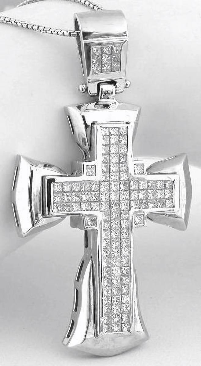 Real Diamond Cross Pendant in solid 18k White Gold with 4 carats of Invisibly set Princess Cut Diamonds